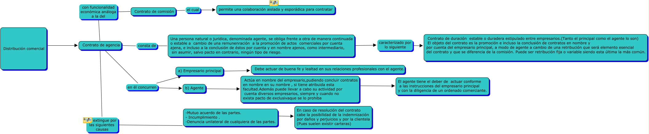 Baldufes reunides, Contrato de comisión el cual permite una colaboración aislada y esporádica para contratar, Contrato de agencia en él concurren b) Agente, Contrato de agencia con funcionalidad económica análoga a la del Contrato de comisión, Contrato de agencia consta de Una persona natural o jurídica, denominada agente, se obliga frente a otra de manera continuada o estable a cambio de una remunenración a la promoción de actos comerciales por cuenta ajena, e incluso a la conclusión de éstos por cuenta y en nombre ajenos, como intermediario, sin asumir, salvo pacto en contrario, ningún tipo de riesgo., b) Agente ???? Actúa en nombre del empresario,pudiendo concluir contratos en nombre en su nombre , si tiene atribuida esta facultad.Además puede llevar a cabo su actividad por cuenta diversos empresarios, siempre y cuando no exista pacto de exclusivaque se lo prohiba, Contrato de agencia en él concurren a) Empresario principal, Una persona natural o jurídica, denominada agente, se obliga frente a otra de manera continuada o estable a cambio de una remunenración a la promoción de actos comerciales por cuenta ajena, e incluso a la conclusión de éstos por cuenta y en nombre ajenos, como intermediario, sin asumir, salvo pacto en contrario, ningún tipo de riesgo. caracterizado por lo siguiente Contrato de duración estable o duradera estipulado entre empresarios.(Tanto el principal como el agente lo son) El objeto del contrato es la promoción e incluso la conclusión de contratos en nombre y por cuenta del empresario principal, a modo de agente a cambio de una retribución que será elemento esencial del contrato y que se diferencia de la comisión. Puede ser retribución fija o variable siendo esta última la más común., -Mutuo acuerdo de las partes. - Incumplimiento . -Denuncia unilateral de cualquiera de las partes. ???? En caso de resolución del contrato cabe la posibilidad de la indemnización por daños y perjuicios y por la clientela (Pues suelen existir carteras), Distribución comercial ???? Contrato de agencia, a) Empresario principal ???? Debe actuar de buena fe y lealtad en sus relaciones profesionales con el agente.