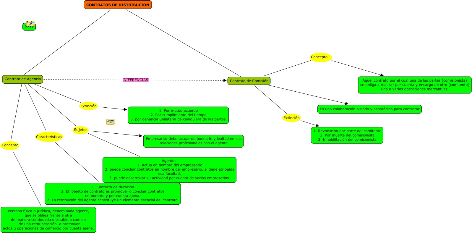 napa Baldufes Jessica, Contrato de Agencia Características 1. Contrato de duración 2. El objeto de contrato es promover o concluir contratos en nombre y por cuenta ajena. 2. La retribución del agente constituye un elemento esencial del contrato., Contrato de Comisión Concepto Aquel contrato por el cual una de las partes (comisionista) se obliga a realizar por cuenta y encargo de otro (comitente) una o varias operaciones mercantiles., Contrato de Comisión Extinción 1. Revocación por parte del comitente 2. Por muerte del comisionista 3. Inhabilitación del comisionista, Contrato de Agencia DIFERENCIAS Contrato de Comisión, Contrato de Agencia Extinción 1. Por mutuo acuerdo 2. Por cumplimiento del tiempo 3. por denuncia unilateral de cualquiera de las partes., CONTRATOS DE DISTRIBUCIÓN C Contrato de Agencia, Contrato de Comisión ???? Es una colaboración aislada y esporádica para contratar, Contrato de Agencia Sujetos Empresario: debe actuar de buena fe y lealtad en sus relaciones profesionales con el agente, CONTRATOS DE DISTRIBUCIÓN ???? Contrato de Comisión, Contrato de Agencia Concepto Persona física o jurídica, denominada agente, que se obliga frente a otra de manera continuada o estable a cambio de una remuneración, a promover actos u operaciones de comercio por cuenta ajena.