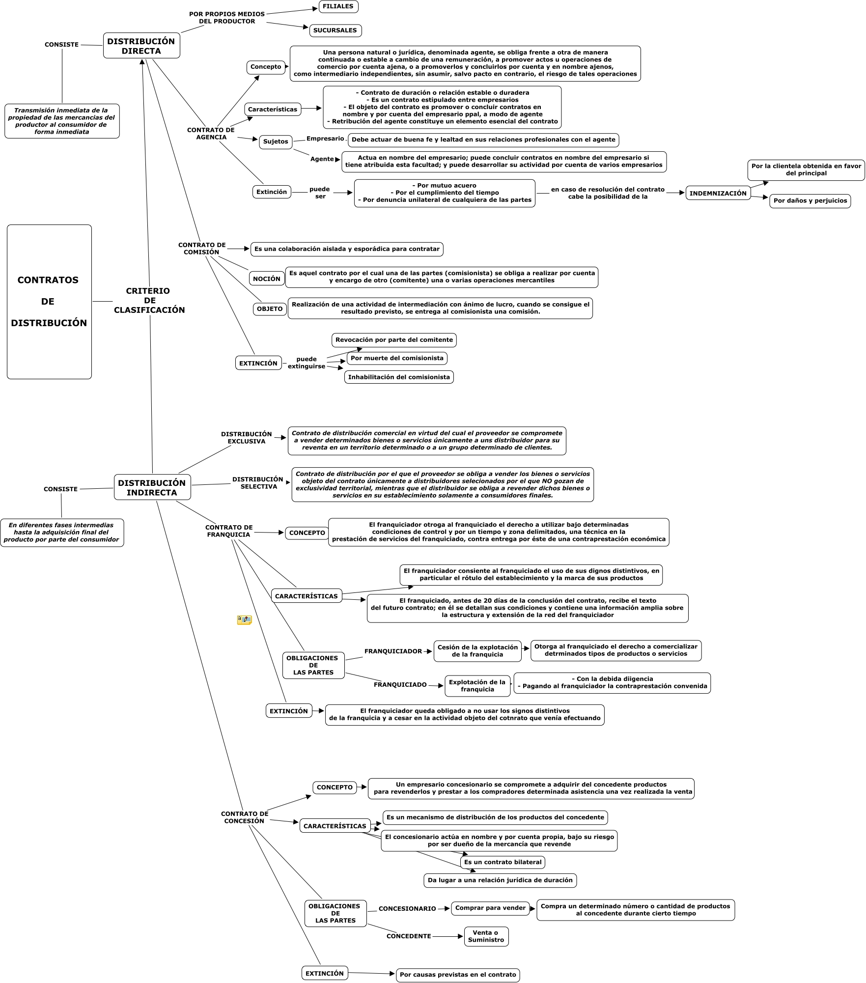contrato de distribucion (caso 6), DISTRIBUCIÓN INDIRECTA CONTRATO DE CONCESIÓN CARACTERÍSTICAS, CARACTERÍSTICAS ???? Es un contrato bilateral, DISTRIBUCIÓN INDIRECTA CONTRATO DE CONCESIÓN OBLIGACIONES DE LAS PARTES, DISTRIBUCIÓN DIRECTA CONTRATO DE AGENCIA Concepto, EXTINCIÓN puede extinguirse Inhabilitación del comisionista, INDEMNIZACIÓN ???? Por daños y perjuicios, EXTINCIÓN puede extinguirse Revocación por parte del comitente, DISTRIBUCIÓN INDIRECTA CONTRATO DE CONCESIÓN EXTINCIÓN, DISTRIBUCIÓN DIRECTA CONSISTE Transmisión inmediata de la propiedad de las mercancias del productor al consumidor de forma inmediata, DISTRIBUCIÓN DIRECTA POR PROPIOS MEDIOS DEL PRODUCTOR FILIALES