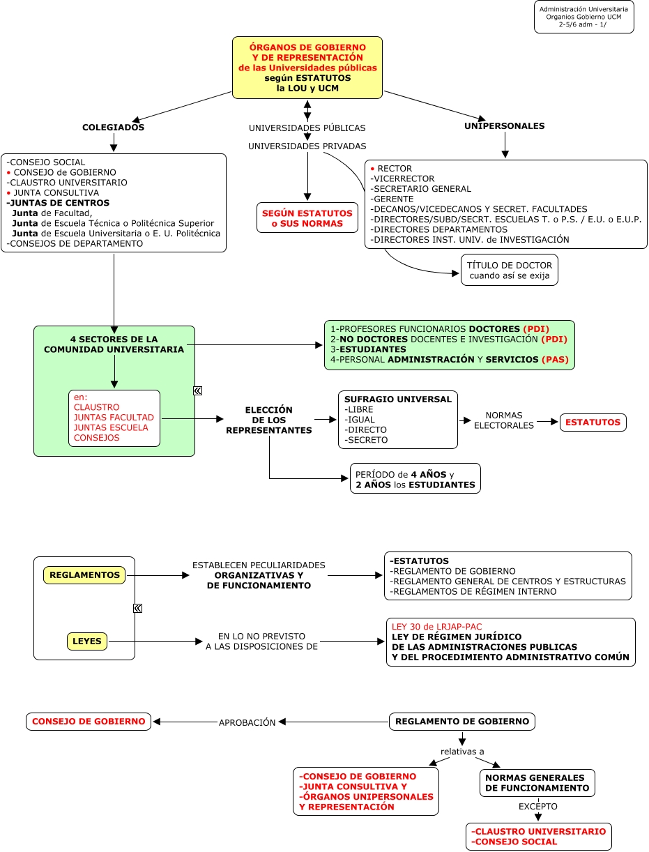 Este mapa conceptual tiene información relacionada a: UCM_01 ORGANOS GOBIERNO 2-5 ESQUEMA-REGLAMENTOS, REGLAMENTO DE GOBIERNO relativas a NORMAS GENERALES DE FUNCIONAMIENTO, ÓRGANOS DE GOBIERNO Y DE REPRESENTACIÓN de las Universidades públicas según ESTATUTOS la LOU y UCM UNIVERSIDADES PRIVADAS TÍTULO DE DOCTOR cuando así se exija, LEYES EN LO NO PREVISTO A LAS DISPOSICIONES DE LEY 30 de LRJAP-PAC LEY DE RÉGIMEN JURÍDICO DE LAS ADMINISTRACIONES PUBLICAS Y DEL PROCEDIMIENTO ADMINISTRATIVO COMÚN, REGLAMENTOS ESTABLECEN PECULIARIDADES ORGANIZATIVAS Y DE FUNCIONAMIENTO -ESTATUTOS -REGLAMENTO DE GOBIERNO -REGLAMENTO GENERAL DE CENTROS Y ESTRUCTURAS -REGLAMENTOS DE RÉGIMEN INTERNO, -CONSEJO SOCIAL • CONSEJO de GOBIERNO -CLAUSTRO UNIVERSITARIO • JUNTA CONSULTIVA -JUNTAS DE CENTROS Junta de Facultad, Junta de Escuela Técnica o Politécnica Superior Junta de Escuela Universitaria o E. U. Politécnica -CONSEJOS DE DEPARTAMENTO 4 SECTORES DE LA COMUNIDAD UNIVERSITARIA 1-PROFESORES FUNCIONARIOS DOCTORES (PDI) 2-NO DOCTORES DOCENTES E INVESTIGACIÓN (PDI) 3-ESTUDIANTES 4-PERSONAL ADMINISTRACIÓN Y SERVICIOS (PAS), en: CLAUSTRO JUNTAS FACULTAD JUNTAS ESCUELA CONSEJOS ELECCIÓN DE LOS REPRESENTANTES SUFRAGIO UNIVERSAL -LIBRE -IGUAL -DIRECTO -SECRETO, ÓRGANOS DE GOBIERNO Y DE REPRESENTACIÓN de las Universidades públicas según ESTATUTOS la LOU y UCM COLEGIADOS -CONSEJO SOCIAL • CONSEJO de GOBIERNO -CLAUSTRO UNIVERSITARIO • JUNTA CONSULTIVA -JUNTAS DE CENTROS Junta de Facultad, Junta de Escuela Técnica o Politécnica Superior Junta de Escuela Universitaria o E. U. Politécnica -CONSEJOS DE DEPARTAMENTO, ÓRGANOS DE GOBIERNO Y DE REPRESENTACIÓN de las Universidades públicas según ESTATUTOS la LOU y UCM UNIPERSONALES • RECTOR -VICERRECTOR -SECRETARIO GENERAL -GERENTE -DECANOS/VICEDECANOS Y SECRET. FACULTADES -DIRECTORES/SUBD/SECRT. ESCUELAS T. o P.S. / E.U. o E.U.P. -DIRECTORES DEPARTAMENTOS -DIRECTORES INST. UNIV. de INVESTIGACIÓN, REGLAMENTO DE GOBIERNO relativas a -CONSEJO DE GOBIERNO -JUNTA CONSULTIVA Y -ÓRGANOS UNIPERSONALES Y REPRESENTACIÓN, NORMAS GENERALES DE FUNCIONAMIENTO EXCEPTO -CLAUSTRO UNIVERSITARIO -CONSEJO SOCIAL, en: CLAUSTRO JUNTAS FACULTAD JUNTAS ESCUELA CONSEJOS ELECCIÓN DE LOS REPRESENTANTES PERÍODO de 4 AÑOS y 2 AÑOS los ESTUDIANTES, -CONSEJO SOCIAL • CONSEJO de GOBIERNO -CLAUSTRO UNIVERSITARIO • JUNTA CONSULTIVA -JUNTAS DE CENTROS Junta de Facultad, Junta de Escuela Técnica o Politécnica Superior Junta de Escuela Universitaria o E. U. Politécnica -CONSEJOS DE DEPARTAMENTO 4 SECTORES DE LA COMUNIDAD UNIVERSITARIA en: CLAUSTRO JUNTAS FACULTAD JUNTAS ESCUELA CONSEJOS, ÓRGANOS DE GOBIERNO Y DE REPRESENTACIÓN de las Universidades públicas según ESTATUTOS la LOU y UCM UNIVERSIDADES PRIVADAS SEGÚN ESTATUTOS o SUS NORMAS, SUFRAGIO UNIVERSAL -LIBRE -IGUAL -DIRECTO -SECRETO NORMAS ELECTORALES ESTATUTOS, REGLAMENTO DE GOBIERNO APROBACIÓN CONSEJO DE GOBIERNO