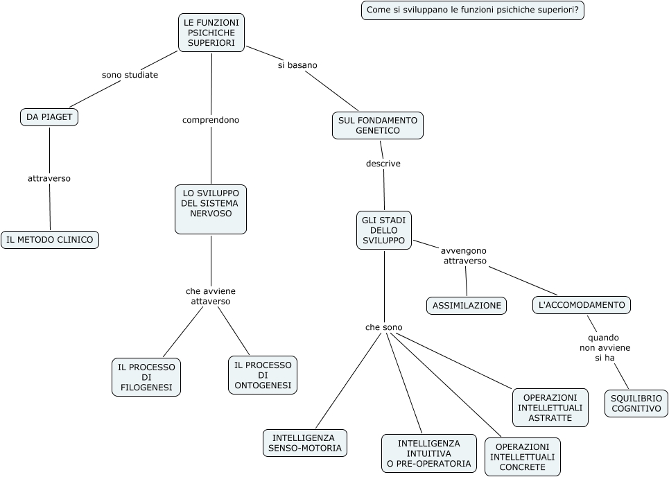 Questa Cmap, creata con IHMC CmapTools, contiene informazioni relative a: Piaget, GLI STADI DELLO SVILUPPO che sono OPERAZIONI INTELLETTUALI CONCRETE, LO SVILUPPO DEL SISTEMA NERVOSO che avviene attaverso IL PROCESSO DI ONTOGENESI, LE FUNZIONI PSICHICHE SUPERIORI si basano SUL FONDAMENTO GENETICO, GLI STADI DELLO SVILUPPO che sono OPERAZIONI INTELLETTUALI ASTRATTE, GLI STADI DELLO SVILUPPO che sono INTELLIGENZA INTUITIVA O PRE-OPERATORIA, LE FUNZIONI PSICHICHE SUPERIORI comprendono LO SVILUPPO DEL SISTEMA NERVOSO, GLI STADI DELLO SVILUPPO che sono INTELLIGENZA SENSO-MOTORIA, SUL FONDAMENTO GENETICO descrive GLI STADI DELLO SVILUPPO, LE FUNZIONI PSICHICHE SUPERIORI sono studiate DA PIAGET, DA PIAGET attraverso IL METODO CLINICO, GLI STADI DELLO SVILUPPO avvengono attraverso L'ACCOMODAMENTO, GLI STADI DELLO SVILUPPO avvengono attraverso ASSIMILAZIONE, LO SVILUPPO DEL SISTEMA NERVOSO che avviene attaverso IL PROCESSO DI FILOGENESI, L'ACCOMODAMENTO quando non avviene si ha SQUILIBRIO COGNITIVO