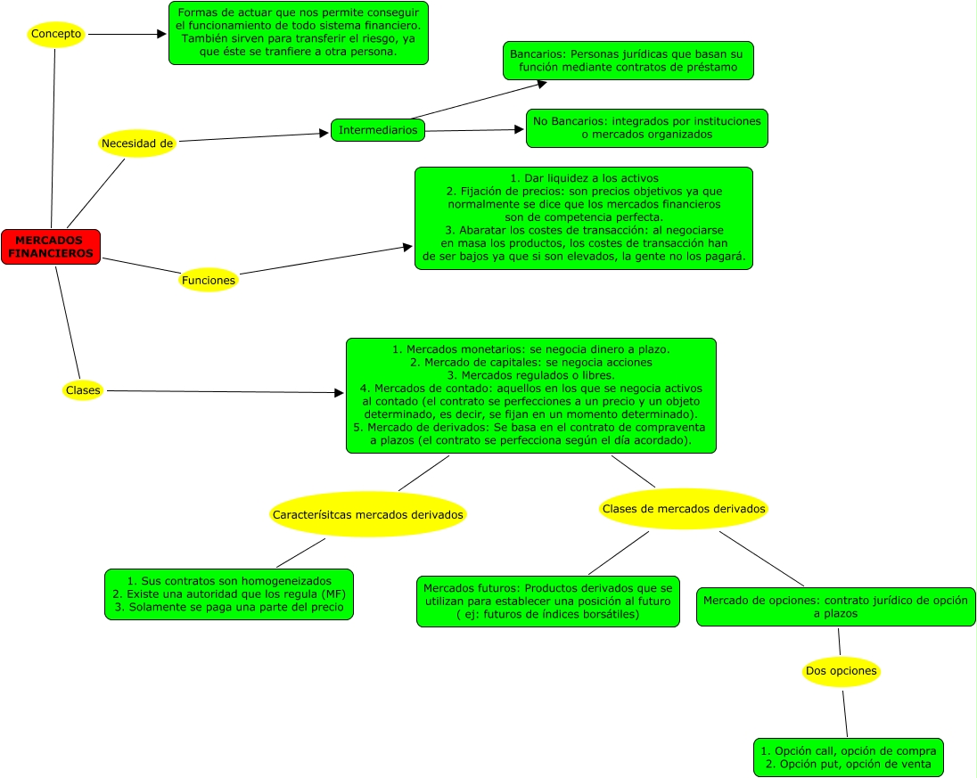mapa caso bolsa Jessica, Intermediarios ???? No Bancarios: integrados por instituciones o mercados organizados, 1. Mercados monetarios: se negocia dinero a plazo. 2. Mercado de capitales: se negocia acciones 3. Mercados regulados o libres. 4. Mercados de contado: aquellos en los que se negocia activos al contado (el contrato se perfecciones a un precio y un objeto determinado, es decir, se fijan en un momento determinado). 5. Mercado de derivados: Se basa en el contrato de compraventa a plazos (el contrato se perfecciona según el día acordado). Caracterísitcas mercados derivados 1. Sus contratos son homogeneizados 2. Existe una autoridad que los regula (MF) 3. Solamente se paga una parte del precio, MERCADOS FINANCIEROS Necesidad de Intermediarios, MERCADOS FINANCIEROS Funciones 1. Dar liquidez a los activos 2. Fijación de precios: son precios objetivos ya que normalmente se dice que los mercados financieros son de competencia perfecta. 3. Abaratar los costes de transacción: al negociarse en masa los productos, los costes de transacción han de ser bajos ya que si son elevados, la gente no los pagará., MERCADOS FINANCIEROS Clases 1. Mercados monetarios: se negocia dinero a plazo. 2. Mercado de capitales: se negocia acciones 3. Mercados regulados o libres. 4. Mercados de contado: aquellos en los que se negocia activos al contado (el contrato se perfecciones a un precio y un objeto determinado, es decir, se fijan en un momento determinado). 5. Mercado de derivados: Se basa en el contrato de compraventa a plazos (el contrato se perfecciona según el día acordado)., Intermediarios ???? Bancarios: Personas jurídicas que basan su función mediante contratos de préstamo, 1. Mercados monetarios: se negocia dinero a plazo. 2. Mercado de capitales: se negocia acciones 3. Mercados regulados o libres. 4. Mercados de contado: aquellos en los que se negocia activos al contado (el contrato se perfecciones a un precio y un objeto determinado, es decir, se fijan en un momento determinado). 5. Mercado de derivados: Se basa en el contrato de compraventa a plazos (el contrato se perfecciona según el día acordado). Clases de mercados derivados Mercado de opciones: contrato jurídico de opción a plazos, 1. Mercados monetarios: se negocia dinero a plazo. 2. Mercado de capitales: se negocia acciones 3. Mercados regulados o libres. 4. Mercados de contado: aquellos en los que se negocia activos al contado (el contrato se perfecciones a un precio y un objeto determinado, es decir, se fijan en un momento determinado). 5. Mercado de derivados: Se basa en el contrato de compraventa a plazos (el contrato se perfecciona según el día acordado). Clases de mercados derivados Mercados futuros: Productos derivados que se utilizan para establecer una posición al futuro ( ej: futuros de índices borsátiles), MERCADOS FINANCIEROS Concepto Formas de actuar que nos permite conseguir el funcionamiento de todo sistema financiero. También sirven para transferir el riesgo, ya que éste se tranfiere a otra persona., Mercado de opciones: contrato jurídico de opción a plazos Dos opciones 1. Opción call, opción de compra 2. Opción put, opción de venta