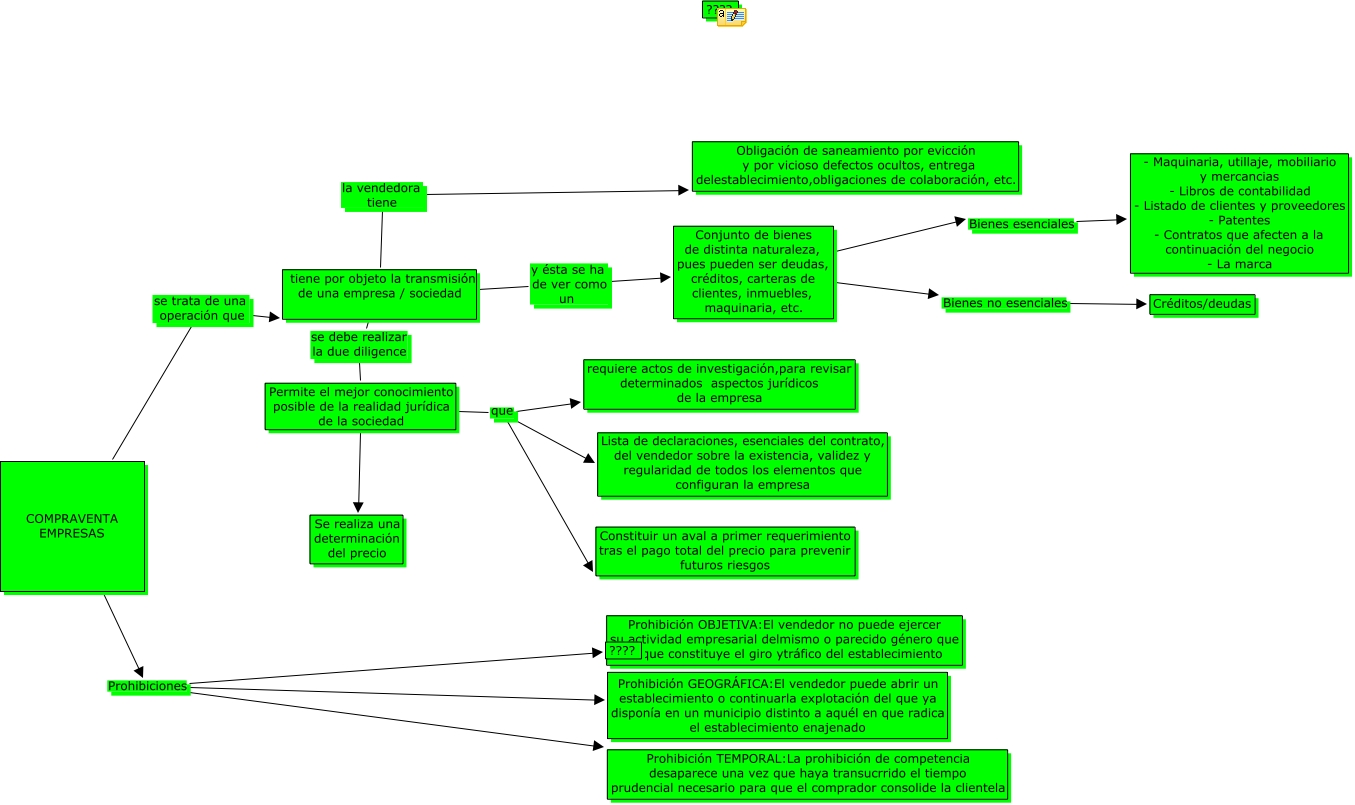 TRANSMISION EMPRESA, COMPRAVENTA EMPRESAS Prohibiciones Prohibición GEOGRÁFICA:El vendedor puede abrir un establecimiento o continuarla explotación del que ya disponía en un municipio distinto a aquél en que radica el establecimiento enajenado, Conjunto de bienes de distinta naturaleza, pues pueden ser deudas, créditos, carteras de clientes, inmuebles, maquinaria, etc. Bienes esenciales - Maquinaria, utillaje, mobiliario y mercancias - Libros de contabilidad - Listado de clientes y proveedores - Patentes - Contratos que afecten a la continuación del negocio - La marca, tiene por objeto la transmisión de una empresa / sociedad y ésta se ha de ver como un Conjunto de bienes de distinta naturaleza, pues pueden ser deudas, créditos, carteras de clientes, inmuebles, maquinaria, etc., COMPRAVENTA EMPRESAS Prohibiciones Prohibición TEMPORAL:La prohibición de competencia desaparece una vez que haya transucrrido el tiempo prudencial necesario para que el comprador consolide la clientela, Permite el mejor conocimiento posible de la realidad jurídica de la sociedad que Lista de declaraciones, esenciales del contrato, del vendedor sobre la existencia, validez y regularidad de todos los elementos que configuran la empresa, Conjunto de bienes de distinta naturaleza, pues pueden ser deudas, créditos, carteras de clientes, inmuebles, maquinaria, etc. Bienes no esenciales Créditos/deudas, tiene por objeto la transmisión de una empresa / sociedad se debe realizar la due diligence Permite el mejor conocimiento posible de la realidad jurídica de la sociedad, COMPRAVENTA EMPRESAS Prohibiciones ????, Permite el mejor conocimiento posible de la realidad jurídica de la sociedad ???? Se realiza una determinación del precio, Permite el mejor conocimiento posible de la realidad jurídica de la sociedad que Constituir un aval a primer requerimiento tras el pago total del precio para prevenir futuros riesgos