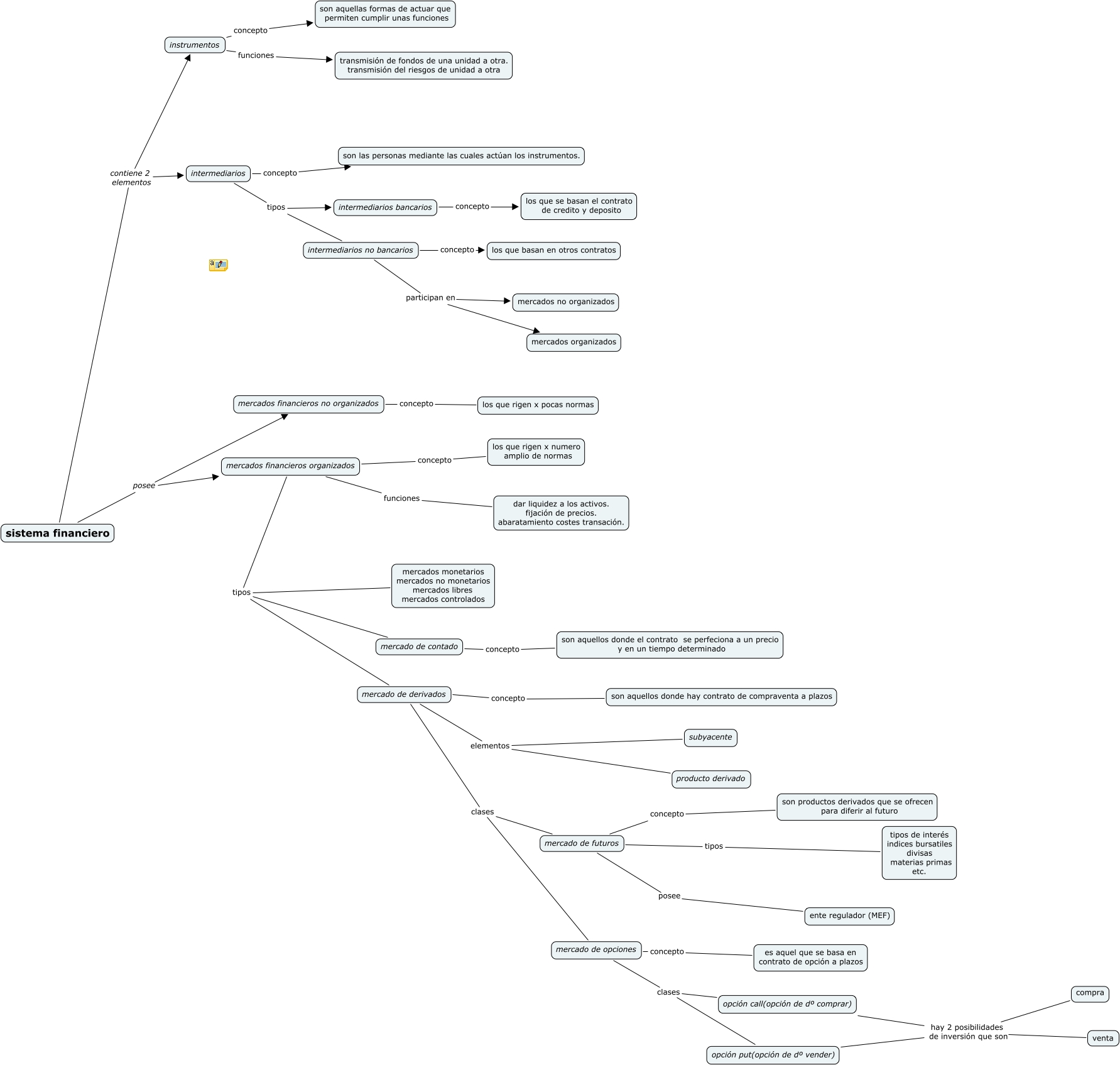 caso bolsa, mercado de opciones clases opción put(opción de dº vender), mercado de contado concepto son aquellos donde el contrato se perfeciona a un precio y en un tiempo determinado, mercado de futuros tipos tipos de interés indices bursatiles divisas materias primas etc., mercados financieros organizados tipos mercado de contado, sistema financiero contiene 2 elementos instrumentos, mercado de futuros concepto son productos derivados que se ofrecen para diferir al futuro, mercado de derivados clases mercado de opciones, sistema financiero posee mercados financieros organizados, mercado de futuros posee ente regulador (MEF), sistema financiero posee mercados financieros no organizados