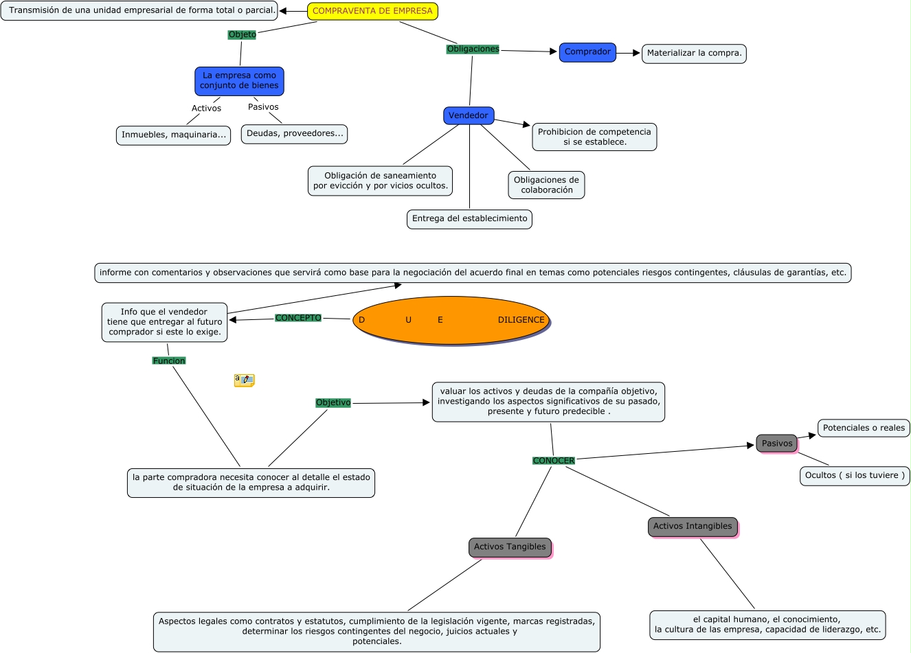 vendo empresa, Comprador ???? Materializar la compra., La empresa como conjunto de bienes Activos Inmuebles, maquinaria..., Vendedor ???? Obligación de saneamiento por evicción y por vicios ocultos., D U E DILIGENCE CONCEPTO Info que el vendedor tiene que entregar al futuro comprador si este lo exige., Pasivos ???? Ocultos ( si los tuviere ), Activos Intangibles ???? el capital humano, el conocimiento, la cultura de las empresa, capacidad de liderazgo, etc., Info que el vendedor tiene que entregar al futuro comprador si este lo exige. ???? informe con comentarios y observaciones que servirá como base para la negociación del acuerdo final en temas como potenciales riesgos contingentes, cláusulas de garantías, etc., valuar los activos y deudas de la compañía objetivo, investigando los aspectos significativos de su pasado, presente y futuro predecible . CONOCER Activos Intangibles, COMPRAVENTA DE EMPRESA Objeto La empresa como conjunto de bienes, Pasivos ???? Potenciales o reales