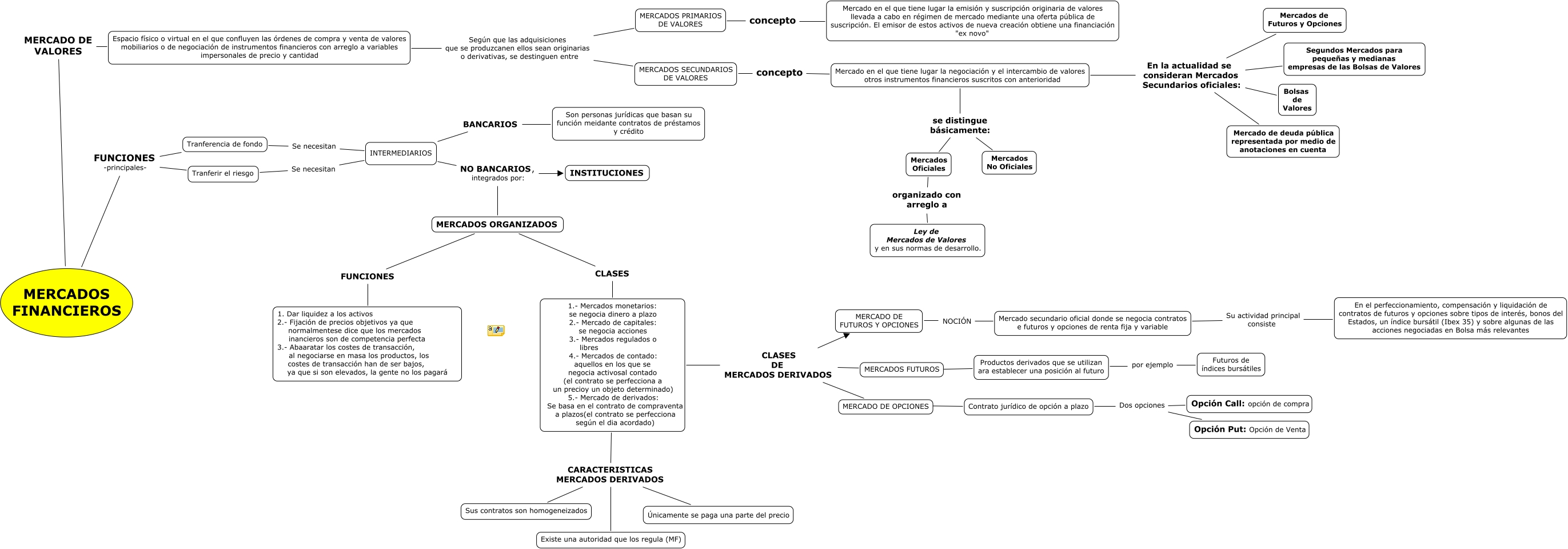 LA BOLSA (CASO NUMERO 8), 1.- Mercados monetarios: se negocia dinero a plazo 2.- Mercado de capitales: se negocia acciones 3.- Mercados regulados o libres 4.- Mercados de contado: aquellos en los que se negocia activosal contado (el contrato se perfecciona a un precioy un objeto determinado) 5.- Mercado de derivados: Se basa en el contrato de compraventa a plazos(el contrato se perfecciona según el dia acordado) CARACTERISTICAS MERCADOS DERIVADOS Únicamente se paga una parte del precio, MERCADOS FINANCIEROS FUNCIONES -principales- Tranferencia de fondo, Mercado en el que tiene lugar la negociación y el intercambio de valores otros instrumentos financieros suscritos con anterioridad En la actualidad se consideran Mercados Secundarios oficiales: Segundos Mercados para pequeñas y medianas empresas de las Bolsas de Valores, MERCADO DE OPCIONES ???? Contrato jurídico de opción a plazo, Tranferir el riesgo Se necesitan INTERMEDIARIOS, 1.- Mercados monetarios: se negocia dinero a plazo 2.- Mercado de capitales: se negocia acciones 3.- Mercados regulados o libres 4.- Mercados de contado: aquellos en los que se negocia activosal contado (el contrato se perfecciona a un precioy un objeto determinado) 5.- Mercado de derivados: Se basa en el contrato de compraventa a plazos(el contrato se perfecciona según el dia acordado) CLASES DE MERCADOS DERIVADOS MERCADOS FUTUROS, MERCADOS FINANCIEROS MERCADO DE VALORES Espacio físico o virtual en el que confluyen las órdenes de compra y venta de valores mobiliarios o de negociación de instrumentos financieros con arreglo a variables impersonales de precio y cantidad, Mercado en el que tiene lugar la negociación y el intercambio de valores otros instrumentos financieros suscritos con anterioridad se distingue básicamente: Mercados Oficiales, MERCADOS SECUNDARIOS DE VALORES concepto Mercado en el que tiene lugar la negociación y el intercambio de valores otros instrumentos financieros suscritos con anterioridad, Mercado secundario oficial donde se negocia contratos e futuros y opciones de renta fija y variable Su actividad principal consiste En el perfeccionamiento, compensación y liquidación de contratos de futuros y opciones sobre tipos de interés, bonos del Estados, un índice bursátil (Ibex 35) y sobre algunas de las acciones negociadas en Bolsa más relevantes