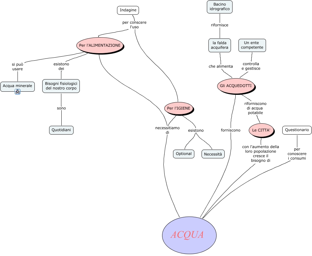 Questa Mappa Concettuale ha informazioni correlate a: L'acqua e la falda, Indagine per conscere l'uso Per l'IGIENE, Per l'IGIENE esistono Necessità, Per l'ALIMENTAZIONE esistono dei Bisogni fisiologici del nostro corpo, Per l'IGIENE necessitiamo di ACQUA, Questionario per conoscere i consumi ACQUA, Bisogni fisiologici del nostro corpo sono Quotidiani, Per l'ALIMENTAZIONE si può usare Acqua minerale, Gli ACQUEDOTTI riforniscono di acqua potabile Le CITTA', Bacino idrografico rifornisce la falda acquifera, la falda acquifera che alimenta Gli ACQUEDOTTI