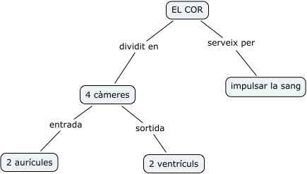 Este mapa conceptual tiene información relacionada a: el cor, EL COR serveix per impulsar la sang, 4 càmeres sortida 2 ventrículs, EL COR dividit en 4 càmeres, 4 càmeres entrada 2 aurícules