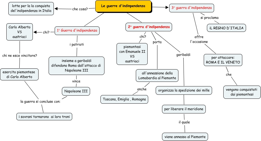 Questa Mappa Concettuale ha informazioni correlate a: guerre d'indipendenza, per attaccare: ROMA E IL VENETO che vengono conquistati dai piemontesi, 3° guerra d'indipendenza si proclama iL REGNO D'ITALIA, 2° guerra d'indipendenza garibaldi organizza la spedizione dei mille, esercito piemontese di Carlo Alberto la guerra si concluse con: i sovrani tornarono ai loro troni, insieme a garibaldi difendono Roma dall'attacco di Napoleone III vince Napoleone III, 2° guerra d'indipendenza porta all'annessione della Lomabardia al Piemonte, 3° guerra d'indipendenza offre l'occasione per attaccare: ROMA E IL VENETO, 1° Guerra d'indipendenza chi? Carlo Alberto VS austriaci, Le guerre d'indinpendenza ???? 1° Guerra d'indipendenza, Le guerre d'indinpendenza ???? 2° guerra d'indipendenza, 2° guerra d'indipendenza chi? piemontesi con Emanuele II VS austriaci, per liberare il meridione il quale viene annesso al Piemonte, organizza la spedizione dei mille ???? per liberare il meridione, Napoleone III la guerra si concluse con: i sovrani tornarono ai loro troni, all'annessione della Lomabardia al Piemonte anche Toscana, Emiglia , Romagna, Le guerre d'indinpendenza ???? 3° guerra d'indipendenza, 1° Guerra d'indipendenza i patrioti insieme a garibaldi difendono Roma dall'attacco di Napoleone III, Le guerre d'indinpendenza che cosa? lotte per la la conquista del'indipendenza in Italia, Carlo Alberto VS austriaci chi ne esce vincitore? esercito piemontese di Carlo Alberto