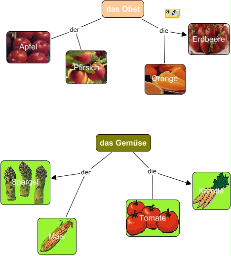 Lina con anotaciones, das Gemüse die Tomate, das Gemüse der Spargel, das Gemüse die Karotte, das Gemüse der Mais, das Obst der Apfel, das Obst die Erdbeere, das Obst die Orange, das Obst der Pfirsich