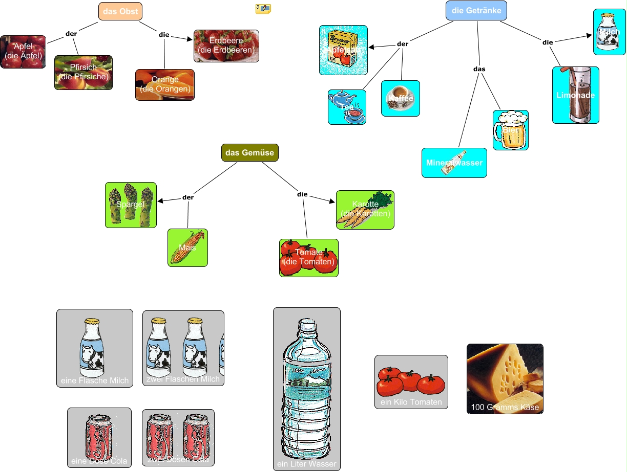 Lina endgültig, die Getränke die Limonade, das Obst der Pfirsich (die Pfirsiche), das Obst die Erdbeere (die Erdbeeren), die Getränke das Bier, das Gemüse der Spargel, die Getränke der Apfelsaft, die Getränke das Mineralwasser, das Gemüse der Mais, das Obst der Apfel (die Äpfel), die Getränke der Tee