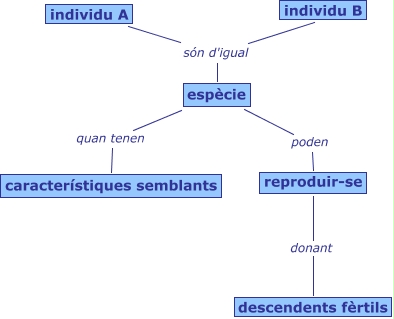 Este mapa conceptual tiene información relacionada a: ecosistemes 4, espècie poden reproduir-se, individu A són d'igual individu B, individu A són d'igual espècie, espècie quan tenen característiques semblants, reproduir-se donant descendents fèrtils