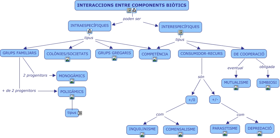 Este mapa conceptual tiene información relacionada a: ecosistemes 3presentació, INTERESPECÍFIQUES tipus COMPETÈNCIA, DE COOPERACIÓ eventual MUTUALISME, +/0 com COMENSALISME, +/- com DEPREDACIÓ, INTERACCIONS ENTRE COMPONENTS BIÒTICS poden ser INTRAESPECÍFIQUES, GRUPS FAMILIARS 2 progenitors MONOGÀMICS, INTRAESPECÍFIQUES tipus COLÒNIES/SOCIETATS, INTRAESPECÍFIQUES tipus GRUPS FAMILIARS, POLIGÀMICS més d'un mascle POLIÀNDRICS, CONSUMIDOR-RECURS són +/-, INTERACCIONS ENTRE COMPONENTS BIÒTICS poden ser INTERESPECÍFIQUES, DE COOPERACIÓ obligada SIMBIOSI, INTRAESPECÍFIQUES tipus COMPETÈNCIA, INTERESPECÍFIQUES tipus CONSUMIDOR-RECURS, +/- com PARASITISME, INTERESPECÍFIQUES tipus DE COOPERACIÓ, +/0 com INQUILINISME, CONSUMIDOR-RECURS són +/0, INTRAESPECÍFIQUES tipus GRUPS GREGARIS, POLIGÀMICS més d'una femella POLIGÍNICS