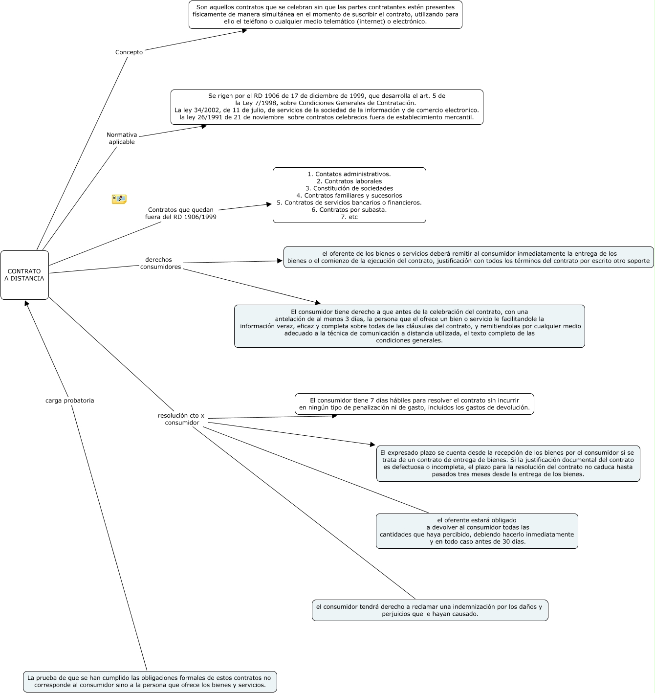 mapa comercio, CONTRATO A DISTANCIA Contratos que quedan fuera del RD 1906/1999 1. Contatos administrativos. 2. Contratos laborales 3. Constitución de sociedades 4. Contratos familiares y sucesorios 5. Contratos de servicios bancarios o financieros. 6. Contratos por subasta. 7. etc, CONTRATO A DISTANCIA resolución cto x consumidor el oferente estará obligado a devolver al consumidor todas las cantidades que haya percibido, debiendo hacerlo inmediatamente y en todo caso antes de 30 días., CONTRATO A DISTANCIA resolución cto x consumidor El expresado plazo se cuenta desde la recepción de los bienes por el consumidor si se trata de un contrato de entrega de bienes. Si la justificación documental del contrato es defectuosa o incompleta, el plazo para la resolución del contrato no caduca hasta pasados tres meses desde la entrega de los bienes., CONTRATO A DISTANCIA Normativa aplicable Se rigen por el RD 1906 de 17 de diciembre de 1999, que desarrolla el art. 5 de la Ley 7/1998, sobre Condiciones Generales de Contratación. La ley 34/2002, de 11 de julio, de servicios de la sociedad de la información y de comercio electronico. la ley 26/1991 de 21 de noviembre sobre contratos celebredos fuera de establecimiento mercantil., La prueba de que se han cumplido las obligaciones formales de estos contratos no corresponde al consumidor sino a la persona que ofrece los bienes y servicios. carga probatoria CONTRATO A DISTANCIA, CONTRATO A DISTANCIA resolución cto x consumidor el consumidor tendrá derecho a reclamar una indemnización por los daños y perjuicios que le hayan causado., CONTRATO A DISTANCIA derechos consumidores el oferente de los bienes o servicios deberá remitir al consumidor inmediatamente la entrega de los bienes o el comienzo de la ejecución del contrato, justificación con todos los términos del contrato por escrito otro soporte, CONTRATO A DISTANCIA derechos consumidores El consumidor tiene derecho a que antes de la celebración del contrato, con una antelación de al menos 3 días, la persona que el ofrece un bien o servicio le facilitandole la información veraz, eficaz y completa sobre todas de las cláusulas del contrato, y remitiendolas por cualquier medio adecuado a la técnica de comunicación a distancia utilizada, el texto completo de las condiciones generales., CONTRATO A DISTANCIA resolución cto x consumidor El consumidor tiene 7 días hábiles para resolver el contrato sin incurrir en ningún tipo de penalización ni de gasto, incluidos los gastos de devolución., CONTRATO A DISTANCIA Concepto Son aquellos contratos que se celebran sin que las partes contratantes estén presentes físicamente de manera simultánea en el momento de suscribir el contrato, utilizando para ello el teléfono o cualquier medio telemático (internet) o electrónico.