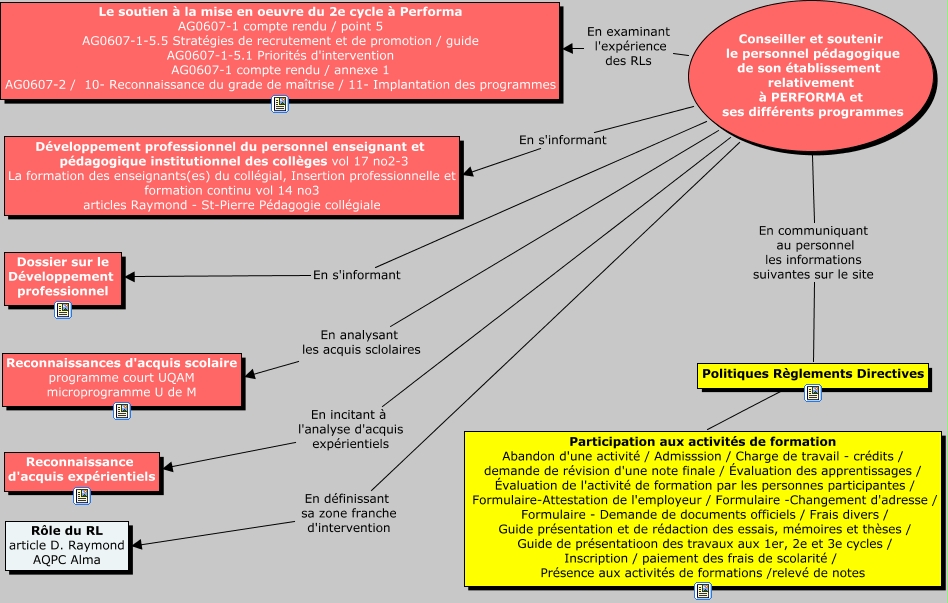 This Concept Map has information related to: Conseiller et soutenir le personnel pédagogique de son établissemement relativement à Performa et ses différents programmes, Conseiller et soutenir le personnel pédagogique de son établissement relativement à PERFORMA et ses différents programmes En s'informant Dossier sur le Développement professionnel, Conseiller et soutenir le personnel pédagogique de son établissement relativement à PERFORMA et ses différents programmes En analysant les acquis sclolaires Reconnaissances d'acquis scolaire programme court UQAM microprogramme U de M, Conseiller et soutenir le personnel pédagogique de son établissement relativement à PERFORMA et ses différents programmes En incitant à l'analyse d'acquis expérientiels Reconnaissance d'acquis expérientiels, Politiques Règlements Directives Participation aux activités de formation Abandon d'une activité / Admisssion / Charge de travail - crédits / demande de révision d'une note finale / Évaluation des apprentissages / Évaluation de l'activité de formation par les personnes participantes / Formulaire-Attestation de l'employeur / Formulaire -Changement d'adresse / Formulaire - Demande de documents officiels / Frais divers / Guide présentation et de rédaction des essais, mémoires et thèses / Guide de présentatioon des travaux aux 1er, 2e et 3e cycles / Inscription / paiement des frais de scolarité / Présence aux activités de formations /relevé de notes, Conseiller et soutenir le personnel pédagogique de son établissement relativement à PERFORMA et ses différents programmes En s'informant Développement professionnel du personnel enseignant et pédagogique institutionnel des collèges vol 17 no2-3 La formation des enseignants(es) du collégial, Insertion professionnelle et formation continu vol 14 no3 articles Raymond - St-Pierre Pédagogie collégiale, Conseiller et soutenir le personnel pédagogique de son établissement relativement à PERFORMA et ses différents programmes En définissant sa zone franche d'intervention Rôle du RL article D. Raymond AQPC Alma, Conseiller et soutenir le personnel pédagogique de son établissement relativement à PERFORMA et ses différents programmes En examinant l'expérience des RLs Le soutien à la mise en oeuvre du 2e cycle à Performa AG0607-1 compte rendu / point 5 AG0607-1-5.5 Stratégies de recrutement et de promotion / guide AG0607-1-5.1 Priorités d'intervention AG0607-1 compte rendu / annexe 1 AG0607-2 / 10- Reconnaissance du grade de maîtrise / 11- Implantation des programmes, Conseiller et soutenir le personnel pédagogique de son établissement relativement à PERFORMA et ses différents programmes En communiquant au personnel les informations suivantes sur le site Politiques Règlements Directives