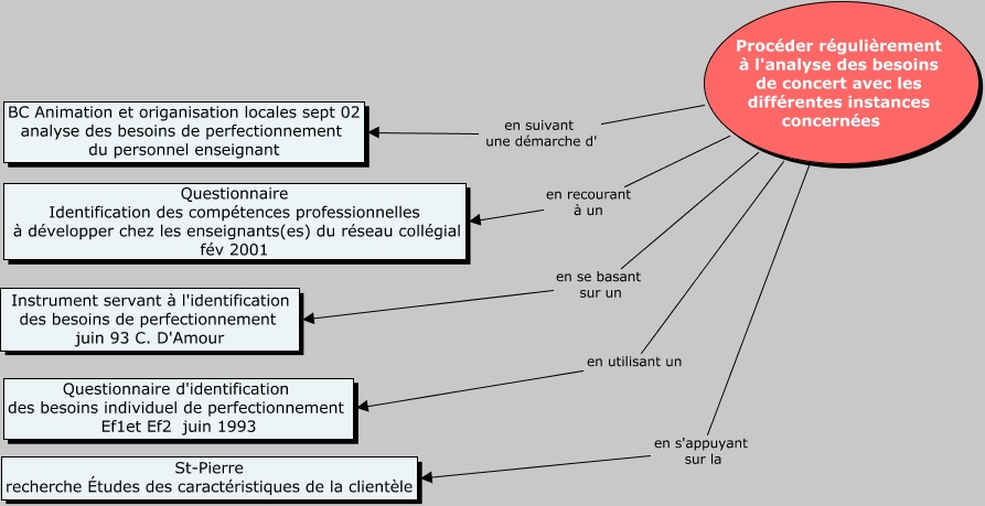 This Concept Map has information related to: Procéder régulièrement à l'analyse de besoins de formation continu du personnel pédagogique de son établissement de concert avec les différentes instances concernées, Procéder régulièrement à l'analyse des besoins de concert avec les différentes instances concernées en s'appuyant sur la St-Pierre recherche Études des caractéristiques de la clientèle, Procéder régulièrement à l'analyse des besoins de concert avec les différentes instances concernées en se basant sur un Instrument servant à l'identification des besoins de perfectionnement juin 93 C. D'Amour, Procéder régulièrement à l'analyse des besoins de concert avec les différentes instances concernées en recourant à un Questionnaire Identification des compétences professionnelles à développer chez les enseignants(es) du réseau collégial fév 2001, Procéder régulièrement à l'analyse des besoins de concert avec les différentes instances concernées en suivant une démarche d' BC Animation et origanisation locales sept 02 analyse des besoins de perfectionnement du personnel enseignant, Procéder régulièrement à l'analyse des besoins de concert avec les différentes instances concernées en utilisant un Questionnaire d'identification des besoins individuel de perfectionnement Ef1et Ef2 juin 1993