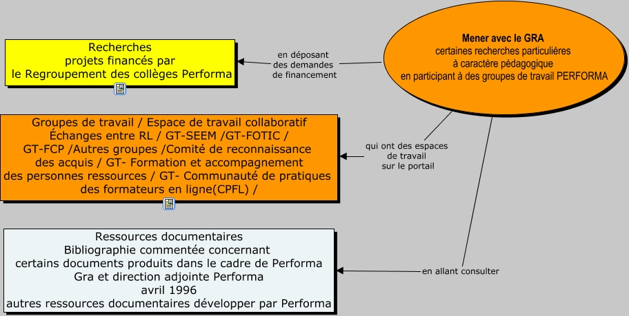 This Concept Map has information related to: Mener avec le GRA certaines recherches particulières à caractère pédagogique en participant à des groupes de travail Performa, Mener avec le GRA certaines recherches particulières à caractère pédagogique en participant à des groupes de travail PERFORMA en allant consulter Ressources documentaires Bibliographie commentée concernant certains documents produits dans le cadre de Performa Gra et direction adjointe Performa avril 1996 autres ressources documentaires développer par Performa, Mener avec le GRA certaines recherches particulières à caractère pédagogique en participant à des groupes de travail PERFORMA qui ont des espaces de travail sur le portail Groupes de travail / Espace de travail collaboratif Échanges entre RL / GT-SEEM /GT-FOTIC / GT-FCP /Autres groupes /Comité de reconnaissance des acquis / GT- Formation et accompagnement des personnes ressources / GT- Communauté de pratiques des formateurs en ligne(CPFL) /, Mener avec le GRA certaines recherches particulières à caractère pédagogique en participant à des groupes de travail PERFORMA en déposant des demandes de financement Recherches projets financés par le Regroupement des collèges Performa