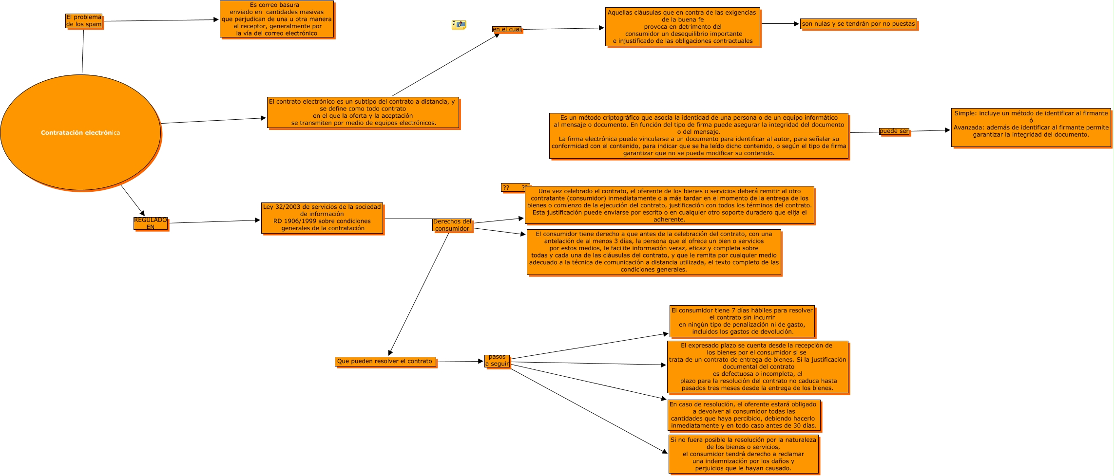 Contratos y comercio electronico, Es un método criptográfico que asocia la identidad de una persona o de un equipo informático al mensaje o documento. En función del tipo de firma puede asegurar la integridad del documento o del mensaje. La firma electrónica puede vincularse a un documento para identificar al autor, para señalar su conformidad con el contenido, para indicar que se ha leído dicho contenido, o según el tipo de firma garantizar que no se pueda modificar su contenido. puede ser Simple: incluye un método de identificar al firmante ó Avanzada: además de identificar al firmante permite garantizar la integridad del documento., Contratación electrónica REGULADO EN Ley 32/2003 de servicios de la sociedad de información RD 1906/1999 sobre condiciones generales de la contratación, Contratación electrónica ???? El contrato electrónico es un subtipo del contrato a distancia, y se define como todo contrato en el que la oferta y la aceptación se transmiten por medio de equipos electrónicos., Ley 32/2003 de servicios de la sociedad de información RD 1906/1999 sobre condiciones generales de la contratación Derechos del consumidor Una vez celebrado el contrato, el oferente de los bienes o servicios deberá remitir al otro contratante (consumidor) inmediatamente o a más tardar en el momento de la entrega de los bienes o comienzo de la ejecución del contrato, justificación con todos los términos del contrato. Esta justificación puede enviarse por escrito o en cualquier otro soporte duradero que elija el adherente., Que pueden resolver el contrato pasos a seguir El consumidor tiene 7 días hábiles para resolver el contrato sin incurrir en ningún tipo de penalización ni de gasto, incluidos los gastos de devolución., El contrato electrónico es un subtipo del contrato a distancia, y se define como todo contrato en el que la oferta y la aceptación se transmiten por medio de equipos electrónicos. en el cual Aquellas cláusulas que en contra de las exigencias de la buena fe provoca en detrimento del consumidor un desequilibrio importante e injustificado de las obligaciones contractuales, Ley 32/2003 de servicios de la sociedad de información RD 1906/1999 sobre condiciones generales de la contratación Derechos del consumidor El consumidor tiene derecho a que antes de la celebración del contrato, con una antelación de al menos 3 días, la persona que el ofrece un bien o servicios por estos medios, le facilite información veraz, eficaz y completa sobre todas y cada una de las cláusulas del contrato, y que le remita por cualquier medio adecuado a la técnica de comunicación a distancia utilizada, el texto completo de las condiciones generales., Que pueden resolver el contrato pasos a seguir El expresado plazo se cuenta desde la recepción de los bienes por el consumidor si se trata de un contrato de entrega de bienes. Si la justificación documental del contrato es defectuosa o incompleta, el plazo para la resolución del contrato no caduca hasta pasados tres meses desde la entrega de los bienes., Aquellas cláusulas que en contra de las exigencias de la buena fe provoca en detrimento del consumidor un desequilibrio importante e injustificado de las obligaciones contractuales por tanto son nulas y se tendrán por no puestas, Que pueden resolver el contrato pasos a seguir Si no fuera posible la resolución por la naturaleza de los bienes o servicios, el consumidor tendrá derecho a reclamar una indemnización por los daños y perjuicios que le hayan causado.