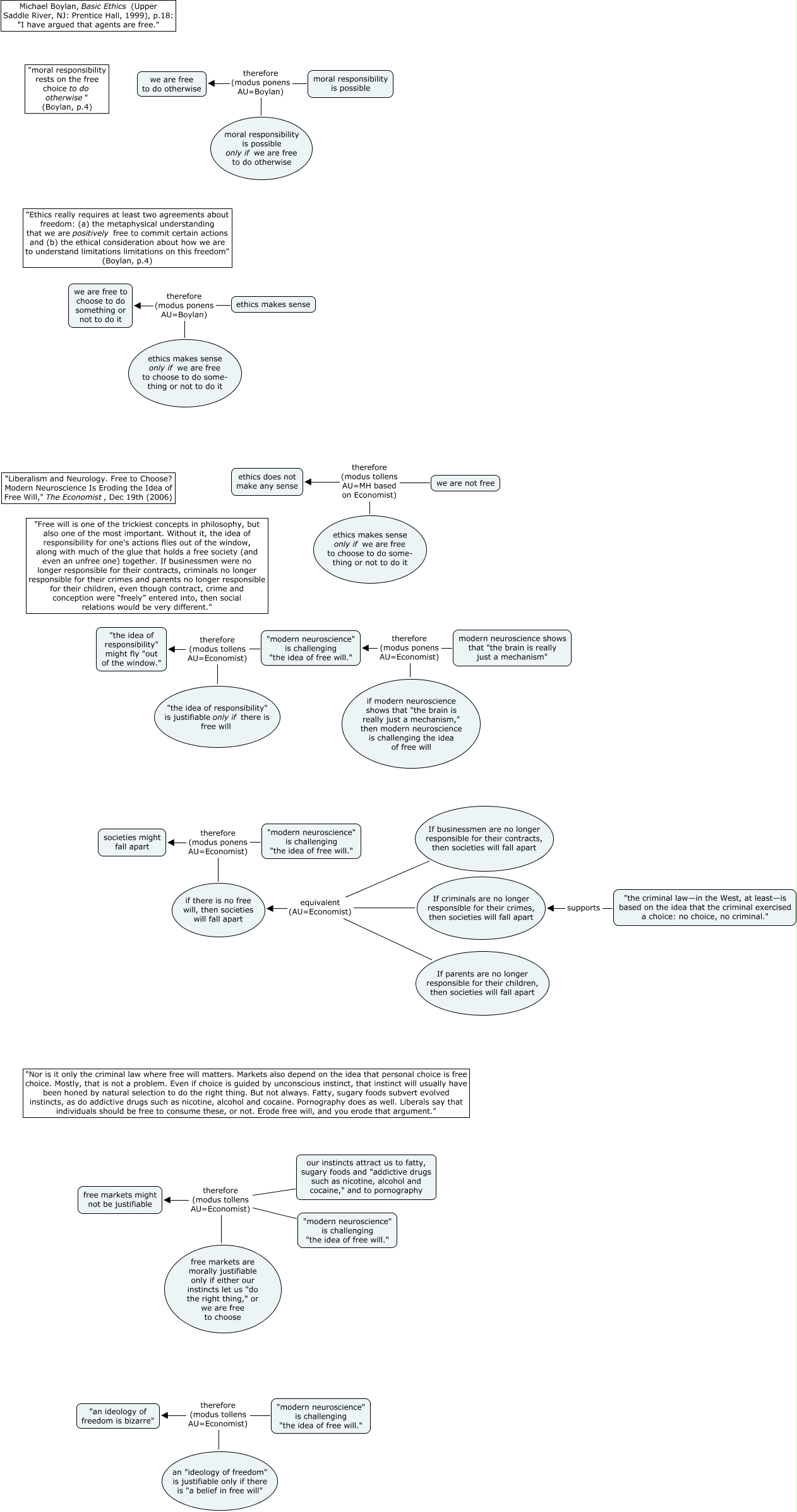This Concept Map, created with IHMC CmapTools, has information related to: Boylan and Economist on free will, "modern neuroscience" is challenging "the idea of free will." therefore (modus ponens AU=Economist) societies might fall apart, "the idea of responsibility" is justifiable only if there is free will therefore (modus tollens AU=Economist) "the idea of responsibility" might fly "out of the window.", If businessmen are no longer responsible for their contracts, then societies will fall apart equivalent (AU=Economist) if there is no free will, then societies will fall apart, "modern neuroscience" is challenging "the idea of free will." therefore (modus tollens AU=Economist) "an ideology of freedom is bizarre", free markets are morally justifiable only if either our instincts let us "do the right thing," or we are free to choose therefore (modus tollens AU=Economist) free markets might not be justifiable, "modern neuroscience" is challenging "the idea of free will." therefore (modus tollens AU=Economist) free markets might not be justifiable, ethics makes sense therefore (modus ponens AU=Boylan) we are free to choose to do something or not to do it, ethics makes sense only if we are free to choose to do some- thing or not to do it therefore (modus tollens AU=MH based on Economist) we are not free, an "ideology of freedom" is justifiable only if there is "a belief in free will" therefore (modus tollens AU=Economist) "an ideology of freedom is bizarre", If criminals are no longer responsible for their crimes, then societies will fall apart equivalent (AU=Economist) if there is no free will, then societies will fall apart, ethics makes sense only if we are free to choose to do some- thing or not to do it therefore (modus ponens AU=Boylan) we are free to choose to do something or not to do it, "the criminal law—in the West, at least—is based on the idea that the criminal exercised a choice: no choice, no criminal." supports If criminals are no longer responsible for their crimes, then societies will fall apart, "modern neuroscience" is challenging "the idea of free will." therefore (modus tollens AU=Economist) "the idea of responsibility" might fly "out of the window.", if there is no free will, then societies will fall apart therefore (modus ponens AU=Economist) societies might fall apart, modern neuroscience shows that "the brain is really just a mechanism" therefore (modus ponens AU=Economist) "modern neuroscience" is challenging "the idea of free will.", ethics makes sense only if we are free to choose to do some- thing or not to do it therefore (modus tollens AU=MH based on Economist) ethics does not make any sense, moral responsibility is possible therefore (modus ponens AU=Boylan) we are free to do otherwise, our instincts attract us to fatty, sugary foods and "addictive drugs such as nicotine, alcohol and cocaine," and to pornography therefore (modus tollens AU=Economist) free markets might not be justifiable, If parents are no longer responsible for their children, then societies will fall apart equivalent (AU=Economist) if there is no free will, then societies will fall apart, if modern neuroscience shows that "the brain is really just a mechanism," then modern neuroscience is challenging the idea of free will therefore (modus ponens AU=Economist) "modern neuroscience" is challenging "the idea of free will."