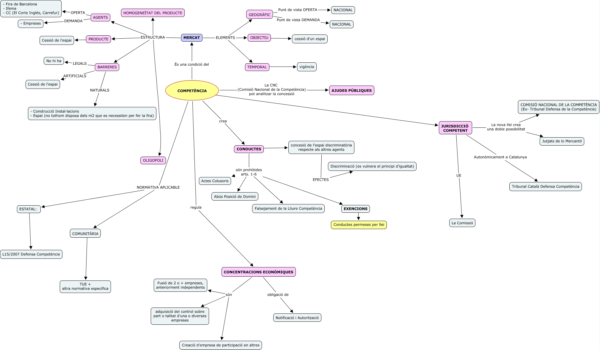 Este mapa conceptual tiene información relacionada a: fira barcelona, CONCENTRACIONS ECONÒMIQUES són Creació d'empresa de participació en altres, CONCENTRACIONS ECONÒMIQUES són Fusió de 2 o + empreses, anteriorment independents, PRODUCTE ???? Cessió de l'espai, BARRERES ARTIFICIALS Cessió de l'espai, COMPETÈNCIA La CNC (Comisió Nacional de la Competència) pot analitzar la concessió AJUDES PÚBLIQUES, TEMPORAL ???? vigència, COMPETÈNCIA NORMATIVA APLICABLE ESTATAL:, CONDUCTES són prohibides arts. 1-6 Abús Posició de Domini, AGENTS DEMANDA - Empreses, BARRERES NATURALS - Construcció Instal·lacions - Espai (no tothom disposa dels m2 que es necessiten per fer la fira), MERCAT ESTRUCTURA BARRERES, JURISDICCIÓ COMPETENT UE La Comissió, MERCAT ESTRUCTURA HOMOGENEÏTAT DEL PRODUCTE, BARRERES LEGALS No hi ha, COMPETÈNCIA És una condició del MERCAT, COMPETÈNCIA NORMATIVA APLICABLE COMUNITÀRIA, COMUNITÀRIA ???? TUE + altra normativa específica, MERCAT ELEMENTS GEOGRÀFIC, CONDUCTES són prohibides arts. 1-6 Falsejament de la Lliure Competència, JURISDICCIÓ COMPETENT Autonòmicament a Catalunya Tribunal Català Defensa Competència