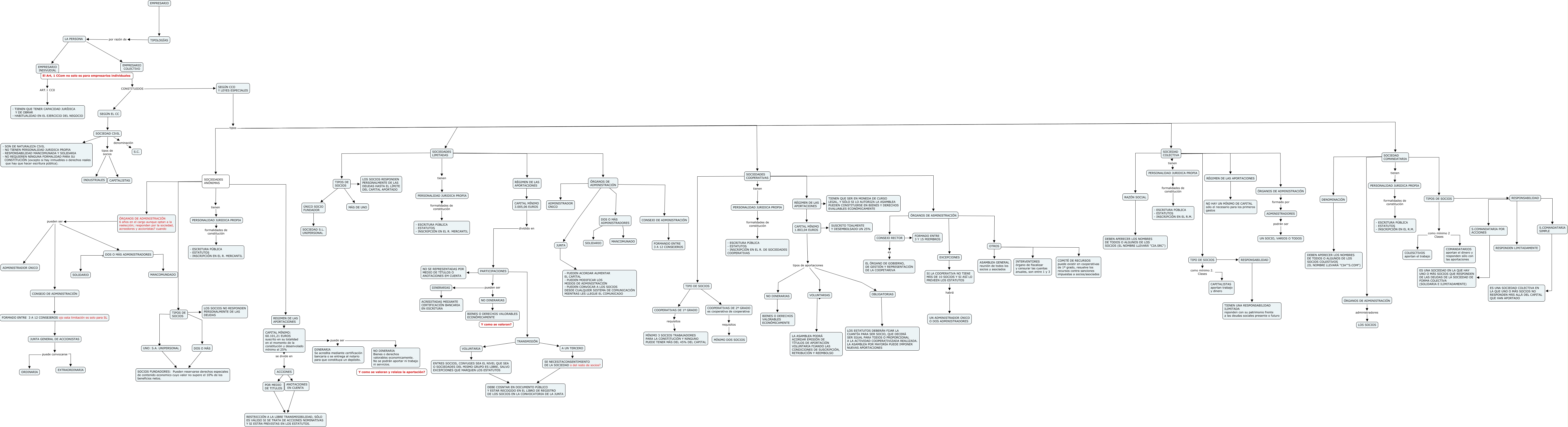 Este Cmap, tiene información relacionada con: PR1, CAPITAL MÍNIMO: 60.101,21 EUROS suscrito en su totalidad en el momento de la constitución y desenvolado mínimo el 25% puede ser NO DINERARIA Bienes o derechos valorables economicamente. No se podrán aportar ni trabajo ni servicios., TIPOS DE SOCIOS ???? MÁS DE UNO, ENTRES SOCIOS, CONYUGES SEA EL NIVEL QUE SEA O SOCIEDADES DEL MISMO GRUPO ES LIBRE, SALVO EXCEPCIONES QUE MARQUEN LOS ESTATUTOS ???? DEBE COSNTAR EN DOCUMENTO PÚBLICO Y ESTAR RECOGIDO EN EL LIBRO DE REGISTRO DE LOS SOCIOS EN LA CONVOCATORIA DE LA JUNTA, CONSEJO DE ADMINISTRACIÓN ???? FORMADO ENTRE 3 A 12 CONSEJEROS ojo esta limitación es solo para SL, LA PERSONA ???? EMPRESARIO COLECTIVO, RÉGIMEN DE LAS APORTACIONES ???? TIENEN QUE SER EN MONEDA DE CURSO LEGAL, Y SÓLO SI LO AUTORIZA LA ASAMBLEA PUEDEN CONSTITUIRSE EN BIENES Y DERECHOS EVALUABLES ECONÓMICAMENTE, SEGÚN EL CC ???? SOCIEDAD CIVIL, CAPITAL MÍNIMO 1.803,04 EUROS ???? SUSCRITO TOALMENTE Y DESEMBOLSADO UN 25%, SOCIEDAD COLECTIVA ???? RÉGIMEN DE LAS APORTACIONES, SOCIEDADES COOPERATIVAS tienen PERSONALIDAD JURIDICA PROPIA, SEGÚN CCO Y LEYES ESPECIALES tipos SOCIEDADES LIMITADAS, ACCIONES ???? ANOTACIONES EN CUENTA, VOLUNTARIA ???? ENTRES SOCIOS, CONYUGES SEA EL NIVEL QUE SEA O SOCIEDADES DEL MISMO GRUPO ES LIBRE, SALVO EXCEPCIONES QUE MARQUEN LOS ESTATUTOS, DOS O MÁS ???? SOCIOS FUNDADORES: Pueden reservarse derechos especiales de contenido economico cuyo valor no supere el 10% de los beneficios netos., SOCIEDADES COOPERATIVAS ???? RÉGIMEN DE LAS APORTACIONES, ÓRGANOS DE ADMINISTRACIÓN administradores LOS SOCIOS, DINERARIAS ???? ACREDITADAS MEDIANTE CERTIFICACIÓN BANCARIA EN ESCRITURA, CONSEJO DE ADMINISTRACIÓN ???? FORMANDO ENTRE 3 A 12 CONSEJEROS, NO DINERARIAS ???? BIENES O DERECHOS VALORABLES ECONÓMICAMENTE, SEGÚN CCO Y LEYES ESPECIALES tipos SOCIEDADES COOPERATIVAS