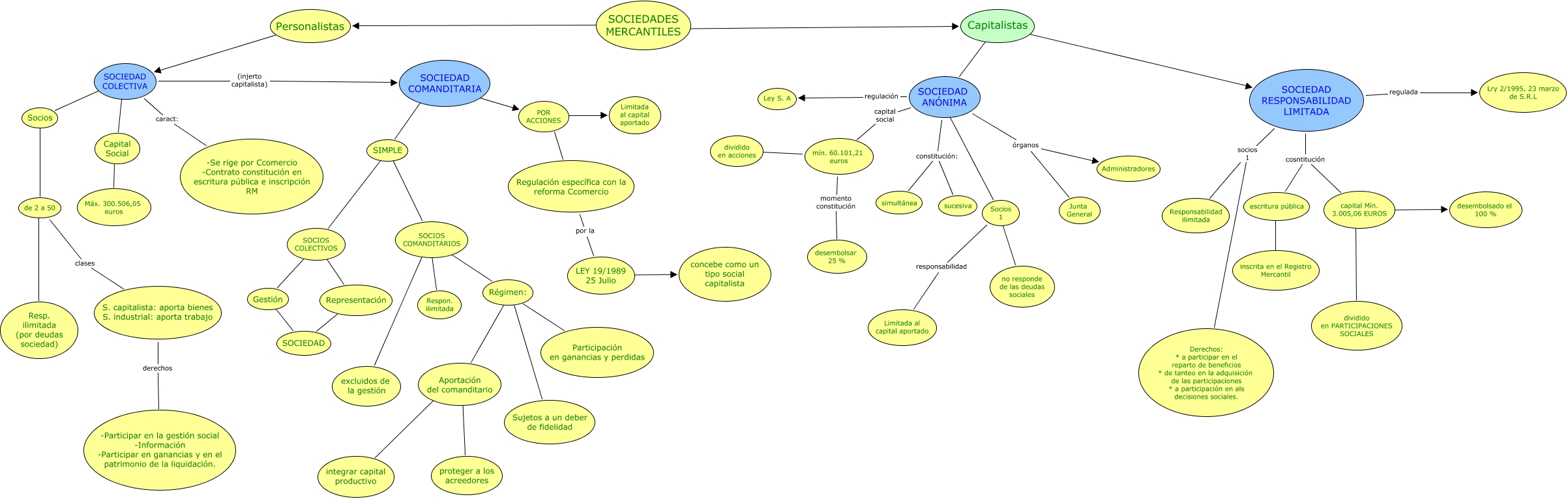 Este mapa conceptual tiene información relacionada a: Principio del todo Mapa nº 1, SOCIEDAD COLECTIVA caract: -Se rige por Ccomercio -Contrato constitución en escritura pública e inscripción RM, Aportación del comanditario ???? proteger a los acreedores, SOCIEDAD RESPONSABILIDAD LIMITADA socios 1 Responsabilidad ilimitada, Capitalistas ???? SOCIEDAD RESPONSABILIDAD LIMITADA, SIMPLE ???? SOCIOS COMANDITARIOS, SOCIEDADES MERCANTILES ???? Capitalistas, Capital Social ???? Máx. 300.506,05 euros, LEY 19/1989 25 Julio ???? concebe como un tipo social capitalista, Socios 1 responsabilidad Limitada al capital aportado, de 2 a 50 clases S. capitalista: aporta bienes S. industrial: aporta trabajo