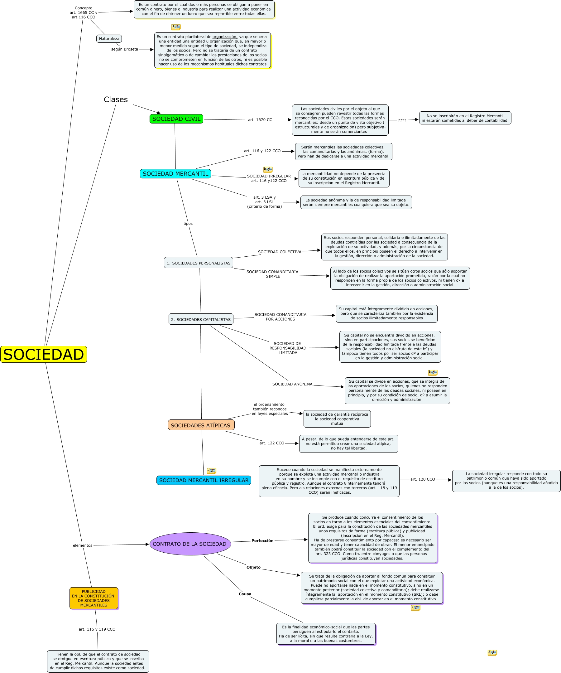 Este mapa conceptual tiene información relacionada a: merca II (1), SOCIEDAD MERCANTIL SOCIEDAD IRREGULAR art. 116 y122 CCO La mercantilidad no depende de la presencia de su constitución en escritura pública y de su inscripción en el Registro Mercantil., SOCIEDAD CIVIL art. 1670 CC Las sociedades civiles por el objeto al que se consagren pueden revestir todas las formas reconocidas por el CCO. Estas sociedades serán mercantiles: desde un punto de vista objetivo ( estructurales y de organizac¡ón) pero subjetiva- mente no serán comerciantes ., SOCIEDAD Concepto art. 1665 CC y art.116 CCO Es un contrato por el cual dos o más personas se obligan a poner en común dinero, bienes o industria para realizar una actividad económica con el fin de obtener un lucro que sea repartible entre todas ellas., 2. SOCIEDADES CAPITALISTAS SOCIEDAD ANÓNIMA Su capital se divide en acciones, que se integra de las aportaciones de los socios, quienes no responden personalmente de las deudas sociales, ni poseen en principio, y por su condición de socio, dº a asumir la dirección y administración., 2. SOCIEDADES CAPITALISTAS SOCIEDAD DE RESPONSABILIDAD LIMITADA Su capital no se encuentra dividido en acciones, sino en participaciones, sus socios se benefician de la responsabilidad limitada frente a las deudas sociales (la sociedad no disfruta de este bº) y tampoco tienen todos por ser socios dº a participar en la gestión y administración social., SOCIEDADES ATÍPICAS el ordenamiento también reconoce en leyes especiales la sociedad de garantía recíproca la sociedad cooperativa mutua, SOCIEDAD elementos CONTRATO DE LA SOCIEDAD, SOCIEDAD MERCANTIL art. 3 LSA y art. 3 LSL (criterio de forma) La sociedad anónima y la de responsabilidad limitada serán siempre mercantiles cualquiera que sea su objeto., SOCIEDADES ATÍPICAS art. 122 CCO A pesar, de lo que pueda entenderse de este art. no está permitido crear una sociedad atípica, no hay tal libertad., CONTRATO DE LA SOCIEDAD Objeto Se trata de la obligación de aportar al fondo común para constituir un patrimonio social con el que explotar una actividad económica. Puede no aportarse nada en el momento constitutivo, sino en un momento posterior (sociedad colectiva y comanditaria); debe realizarse íntegramente la aportación en el momento constitutivo (SRL); o debe cumplirse parcialmente la obl. de aportar en el momento constitutivo.