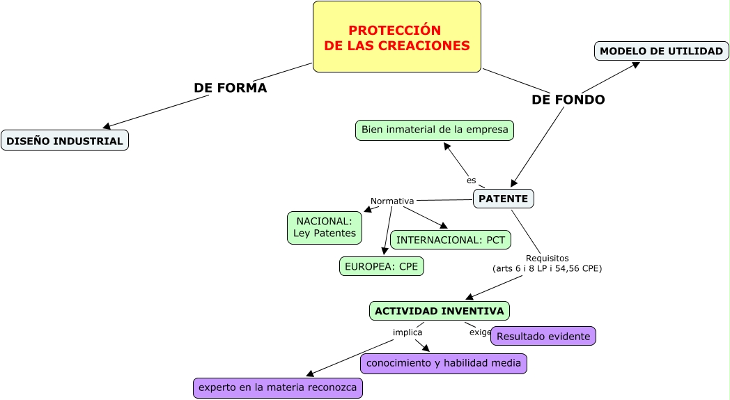 Este mapa conceptual tiene información relacionada a: modelo utilidad, ACTIVIDAD INVENTIVA implica conocimiento y habilidad media, PROTECCIÓN DE LAS CREACIONES DE FORMA DISEÑO INDUSTRIAL, PATENTE Normativa INTERNACIONAL: PCT, PATENTE Normativa EUROPEA: CPE, PATENTE es Bien inmaterial de la empresa, PATENTE Normativa NACIONAL: Ley Patentes, PATENTE Requisitos (arts 6 i 8 LP i 54,56 CPE) ACTIVIDAD INVENTIVA, PROTECCIÓN DE LAS CREACIONES DE FONDO MODELO DE UTILIDAD, ACTIVIDAD INVENTIVA exigencia Resultado evidente, ACTIVIDAD INVENTIVA implica experto en la materia reconozca, PROTECCIÓN DE LAS CREACIONES DE FONDO PATENTE