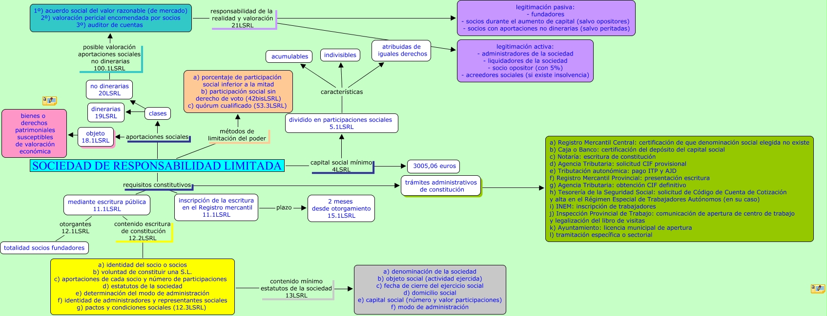 Este mapa conceptual tiene información relacionada a: Práctica 2, mediante escritura pública 11.1LSRL otorgantes 12.1LSRL totalidad socios fundadores, inscripción de la escritura en el Registro mercantil 11.1LSRL plazo 2 meses desde otorgamiento 15.1LSRL, clases ???? dinerarias 19LSRL, 1º) acuerdo social del valor razonable (de mercado) 2º) valoración pericial encomendada por socios 3º) auditor de cuentas responsabilidad de la realidad y valoración 21LSRL legitimación pasiva: - fundadores - socios durante el aumento de capital (salvo opositores) - socios con aportaciones no dinerarias (salvo peritadas), objeto 18.1LSRL ???? bienes o derechos patrimoniales susceptibles de valoración económica, a) identidad del socio o socios b) voluntad de constituir una S.L. c) aportaciones de cada socio y número de participaciones d) estatutos de la sociedad e) determinación del modo de administración f) identidad de administradores y representantes sociales g) pactos y condiciones sociales (12.3LSRL) contenido mínimo estatutos de la sociedad 13LSRL a) denominación de la sociedad b) objeto social (actividad ejercida) c) fecha de cierre del ejercicio social d) domicilio social e) capital social (número y valor participaciones) f) modo de administración, trámites administrativos de constitución ???? a) Registro Mercantil Central: certificación de que denominación social elegida no existe b) Caja o Banco: certificación del depósito del capital social c) Notaría: escritura de constitución d) Agencia Tributaria: solicitud CIF provisional e) Tributación autonómica: pago ITP y AJD f) Registro Mercantil Provincial: presentación escritura g) Agencia Tributaria: obtención CIF definitivo h) Tesorería de la Seguridad Social: solicitud de Código de Cuenta de Cotización y alta en el Régimen Especial de Trabajadores Autónomos (en su caso) i) INEM: inscripción de trabajadores j) Inspección Provincial de Trabajo: comunicación de apertura de centro de trabajo y legalización del libro de visitas k) Ayuntamiento: licencia municipal de apertura l) tramitación específica o sectorial, clases ???? no dinerarias 20LSRL, SOCIEDAD DE RESPONSABILIDAD LIMITADA capital social mínimo 4LSRL 3005,06 euros, SOCIEDAD DE RESPONSABILIDAD LIMITADA requisitos constitutivos mediante escritura pública 11.1LSRL