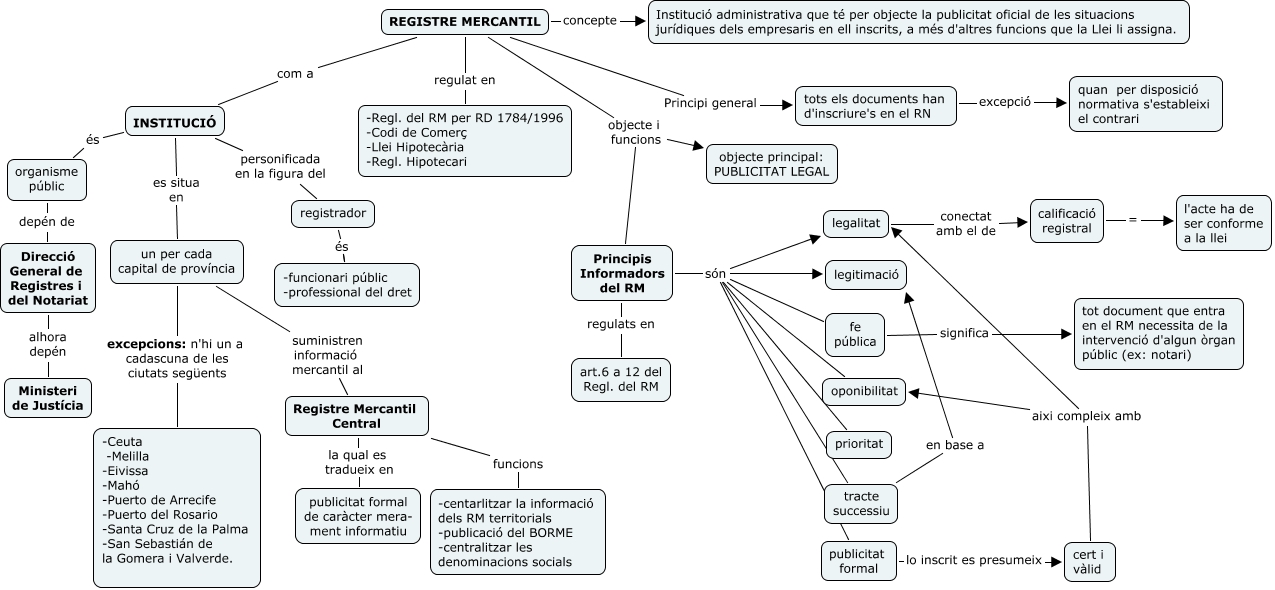 Este mapa conceptual tiene información relacionada a: registre mercantil 2, Principis Informadors del RM són legalitat, Principis Informadors del RM són oponibilitat, REGISTRE MERCANTIL regulat en -Regl. del RM per RD 1784/1996 -Codi de Comerç -Llei Hipotecària -Regl. Hipotecari, fe pública significa tot document que entra en el RM necessita de la intervenció d'algun òrgan públic (ex: notari), cert i vàlid aixi compleix amb oponibilitat, Principis Informadors del RM són fe pública, Principis Informadors del RM són publicitat formal, REGISTRE MERCANTIL Principi general tots els documents han d'inscriure's en el RN, cert i vàlid aixi compleix amb legalitat, REGISTRE MERCANTIL objecte i funcions objecte principal: PUBLICITAT LEGAL, legalitat conectat amb el de calificació registral, Principis Informadors del RM regulats en art.6 a 12 del Regl. del RM, REGISTRE MERCANTIL objecte i funcions Principis Informadors del RM, tots els documents han d'inscriure's en el RN excepció quan per disposició normativa s'estableixi el contrari, calificació registral = l'acte ha de ser conforme a la llei, organisme públic depén de Direcció General de Registres i del Notariat, Principis Informadors del RM són tracte successiu, tracte successiu en base a legitimació, un per cada capital de província suministren informació mercantil al Registre Mercantil Central, publicitat formal lo inscrit es presumeix cert i vàlid