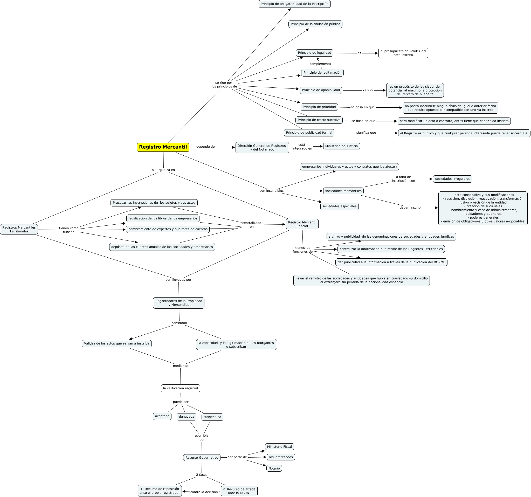 Este mapa conceptual tiene información relacionada a: Registro Mercantil, Registro Mercantil se rige por los principios de Principio de publicidad formal, depósito de las cuentas anuales de las sociedades y empresarios centralizado en Registro Mercantil Central, Registro Mercantil Central tienes las funciones de centralizar la información que recibe de los Registros Territoriales, Registros Mercantiles Territoriales tienen como función nombramiento de expertos y auditores de cuentas, Principio de tracto sucesivo se basa en que para modificar un acto o contrato, antes tiene que haber sido inscrito, sociedades mercantiles a falta de inscripción son sociedades irregulares, Dirección General de Registros y del Notariado está integrado en Ministerio de Justicia, Registro Mercantil se rige por los principios de Principio de legitimación, suspendida recurrible por Recurso Gubernativo, la calificación registral puede ser aceptada