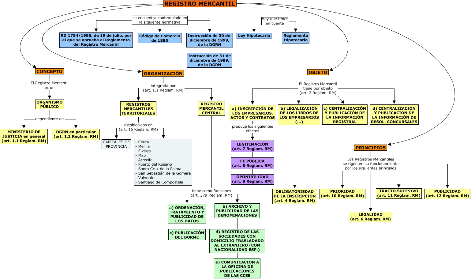 This Concept Map, created with IHMC CmapTools, has information related to: 3er Cmap Dret Mercantil II, PRINCIPIOS Los Registros Mercantiles se rigen en su funcionamiento por los siguientes principios PRIORIDAD (art. 10 Reglam. RM), LEGITIMACIÓN (art. 7 Reglam. RM) ???? FE PÚBLICA (art. 8 Reglam. RM), OBJETO El Registro Mercantil tiene por objeto (art. 2 Reglam. RM) c) CENTRALIZACIÓN Y PUBLICACIÓN DE LA INFORMACIÓN REGISTRAL, REGISTRO MERCANTIL se encuentra contemplado en la siguiente normativa RD 1784/1996, de 19 de julio, por el que se aprueba el Reglamento del Registro Mercantil, REGISTRO MERCANTIL ???? PRINCIPIOS, ORGANIZACIÓN integrada por (art. 1.1 Reglam. RM) REGISTRO MERCANTIL CENTRAL, REGISTRO MERCANTIL se encuentra contemplado en la siguiente normativa Código de Comercio de 1885, CONCEPTO El Registro Mercantil es un ORGANISMO PÚBLICO, REGISTRO MERCANTIL ???? ORGANIZACIÓN, a) INSCRIPCIÓN DE LOS EMPRESARIOS, ACTOS Y CONTRATOS produce los siguientes efectos LEGITIMACIÓN (art. 7 Reglam. RM), PRINCIPIOS Los Registros Mercantiles se rigen en su funcionamiento por los siguientes principios LEGALIDAD (art. 6 Reglam. RM), FE PÚBLICA (art. 8 Reglam. RM) ???? OPONIBILIDAD (art. 9 Reglam. RM), ORGANISMO PÚBLICO dependiente de MINISTERIO DE JUSTICIA en general (art. 1.1 Reglam. RM), a) ORDENACIÓN, TRATAMIENTO Y PUBLICIDAD DE LOS DATOS ???? c) PUBLICACIÓN DEL BORME, PRINCIPIOS Los Registros Mercantiles se rigen en su funcionamiento por los siguientes principios PUBLICIDAD (art. 12 Reglam. RM), b) ARCHIVO Y PUBLICIDAD DE LAS DENOMINACIONES ???? d) REGISTRO DE LAS SOCIEDADES CON DOMICILIO TRASLADADO AL EXTRANJERO (CON NACIONALIDAD ESP.), REGISTRO MERCANTIL Hay que tener en cuenta Ley Hipotecaria, d) REGISTRO DE LAS SOCIEDADES CON DOMICILIO TRASLADADO AL EXTRANJERO (CON NACIONALIDAD ESP.) ???? e) COMUNICACIÓN A LA OFICINA DE PUBLICACIONES DE LAS CCEE, ORGANISMO PÚBLICO dependiente de DGRN en particular (art. 1.2 Reglam. RM), PRINCIPIOS Los Registros Mercantiles se rigen en su funcionamiento por los siguientes principios TRACTO SUCESIVO (art. 11 Reglam. RM)