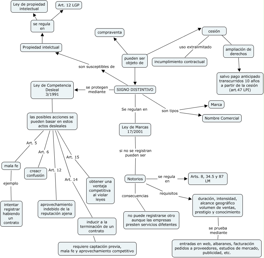 Este Cmap, tiene información relacionada con: CASO 2, se regula en ???? Art. 12 LGP, mala fe ejemplo intentar registrar habiendo un contrato, Propiedad intelctual ???? se regula en, Notorios requisitos duración, intensidad, alcance geográfico volumen de ventas, prestigio y conocimiento, ampliación de derechos ???? salvo pago anticipado transcurridos 10 años a partir de la cesión (art.47 LPI), pueden ser objeto de ???? cesión, cesión ???? ampliación de derechos, SIGNO DISTINTIVO son tipos Marca, se regula en ???? Ley de propiedad intelectual, pueden ser objeto de ???? SIGNO DISTINTIVO, SIGNO DISTINTIVO Se regulan en Ley de Marcas 17/2001, las posibles acciones se pueden basar en estos actos desleales Art. 5 mala fe, Notorios consecuencias no puede registrarse otro aunque las empresas presten servicios difetentes, cesión uso extralimitado incumplimiento contractual, las posibles acciones se pueden basar en estos actos desleales Art. 6 creacr confusión, SIGNO DISTINTIVO son tipos Nombre Comercial, Ley de Marcas 17/2001 si no se registran pueden ser Notorios, inducir a la terminación de un contrato ???? requiere captación previa, mala fe y aprovechamiento competitivo, pueden ser objeto de ???? compraventa, Notorios se regula en Arts. 8, 34.5 y 87 LM