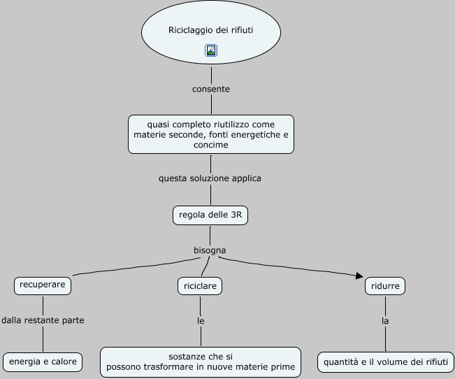 Questa Cmap, creata con IHMC CmapTools, contiene informazioni relative a: Riciclaggio dei rifiuti, Riciclaggio dei rifiuti consente quasi completo riutilizzo come materie seconde, fonti energetiche e concime, regola delle 3R bisogna ridurre, quasi completo riutilizzo come materie seconde, fonti energetiche e concime questa soluzione applica regola delle 3R, ridurre la quantità e il volume dei rifiuti, recuperare dalla restante parte energia e calore, regola delle 3R bisogna recuperare, riciclare le sostanze che si possono trasformare in nuove materie prime, regola delle 3R bisogna riciclare