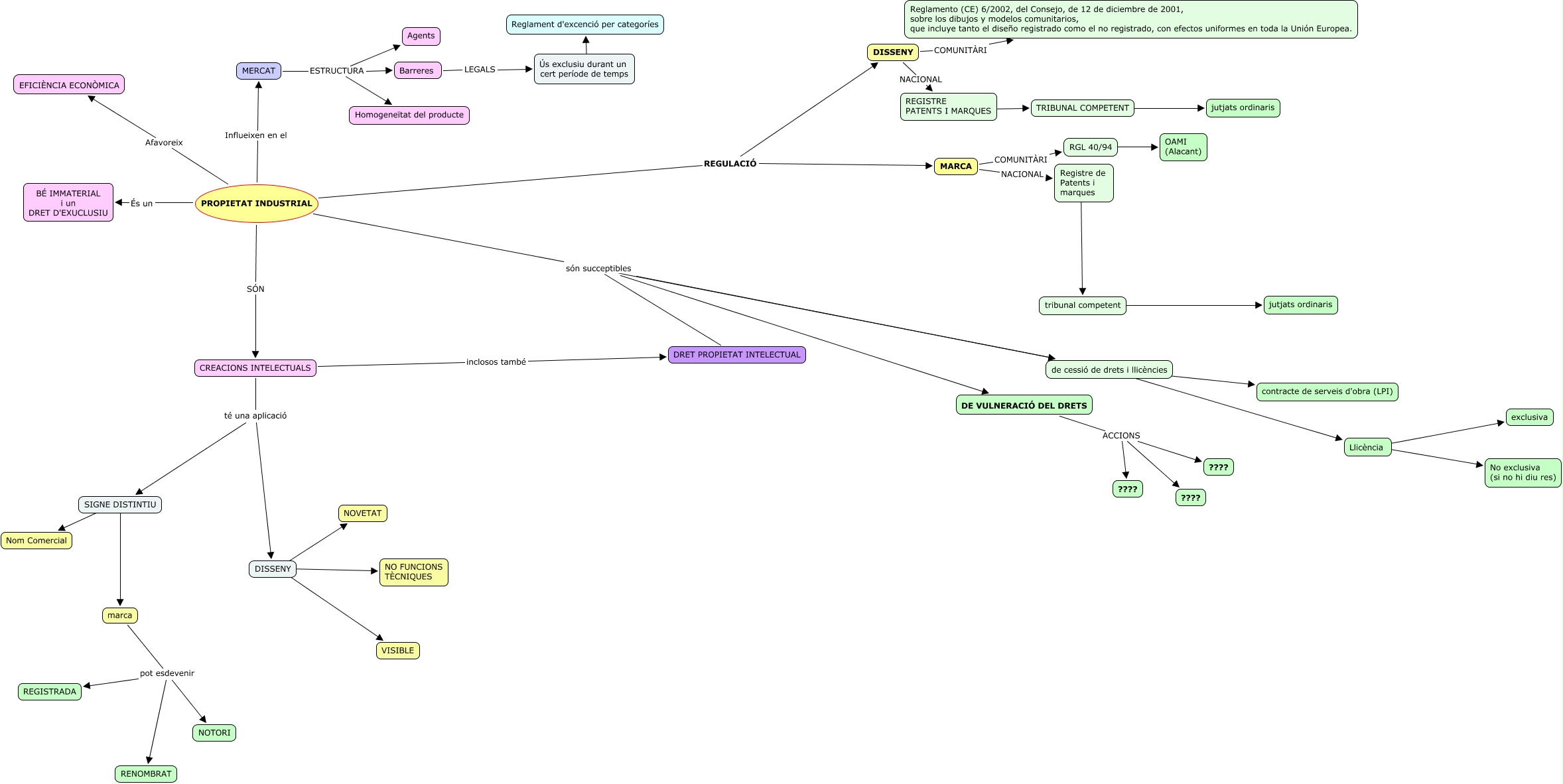 Este mapa conceptual tiene información relacionada a: provisional1 cas2, PROPIETAT INDUSTRIAL són succeptibles DE VULNERACIÓ DEL DRETS, PROPIETAT INDUSTRIAL Afavoreix EFICIÈNCIA ECONÒMICA, TRIBUNAL COMPETENT ???? jutjats ordinaris, DE VULNERACIÓ DEL DRETS ACCIONS ????, DISSENY ???? VISIBLE, marca pot esdevenir NOTORI, SIGNE DISTINTIU ???? Nom Comercial, DISSENY ???? NOVETAT, MARCA COMUNITÀRI RGL 40/94, DRET PROPIETAT INTELECTUAL ???? de cessió de drets i llicències, MERCAT ESTRUCTURA Barreres, Llicència ???? exclusiva, PROPIETAT INDUSTRIAL REGULACIÓ DISSENY, DISSENY COMUNITÀRI Reglamento (CE) 6/2002, del Consejo, de 12 de diciembre de 2001, sobre los dibujos y modelos comunitarios, que incluye tanto el diseño registrado como el no registrado, con efectos uniformes en toda la Unión Europea., Ús exclusiu durant un cert període de temps ???? Reglament d'excenció per categoríes, DE VULNERACIÓ DEL DRETS ACCIONS ????, PROPIETAT INDUSTRIAL SÓN CREACIONS INTELECTUALS, PROPIETAT INDUSTRIAL són succeptibles de cessió de drets i llicències, MERCAT ESTRUCTURA Homogeneïtat del producte, RGL 40/94 ???? OAMI (Alacant)