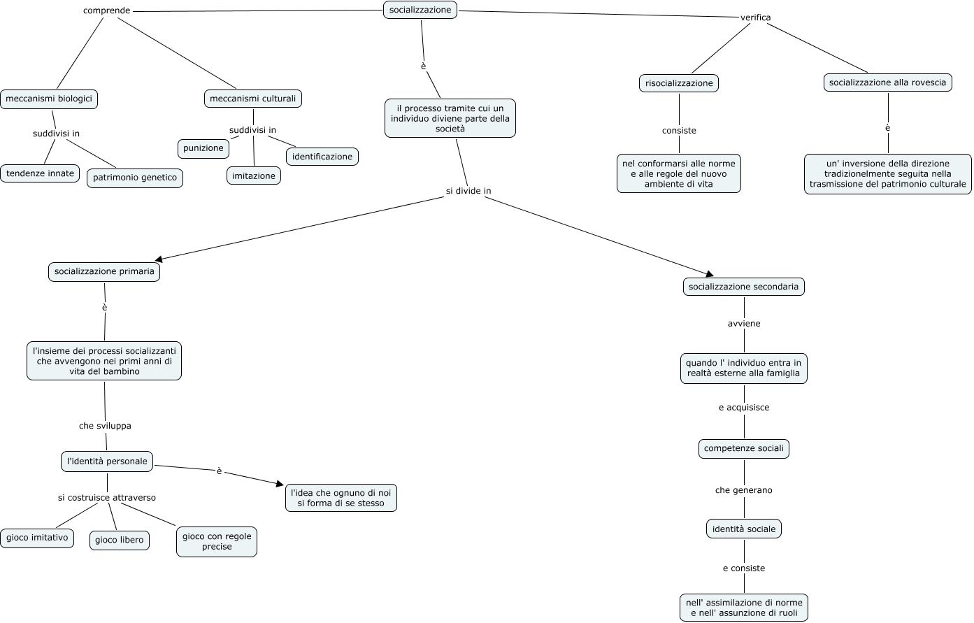 Questa Mappa Concettuale ha informazioni correlate a: socializzazione, socializzazione secondaria avviene quando l' individuo entra in realtà esterne alla famiglia, l'identità personale è l'idea che ognuno di noi si forma di se stesso, competenze sociali che generano identità sociale, socializzazione verifica socializzazione alla rovescia, l'insieme dei processi socializzanti che avvengono nei primi anni di vita del bambino che sviluppa l'identità personale, meccanismi biologici suddivisi in tendenze innate, socializzazione alla rovescia è un' inversione della direzione tradizionelmente seguita nella trasmissione del patrimonio culturale, socializzazione comprende meccanismi biologici, l'identità personale si costruisce attraverso gioco con regole precise, il processo tramite cui un individuo diviene parte della società si divide in socializzazione primaria, meccanismi culturali suddivisi in punizione, l'identità personale si costruisce attraverso gioco imitativo, l'identità personale si costruisce attraverso gioco libero, socializzazione verifica risocializzazione, meccanismi culturali suddivisi in imitazione, socializzazione è il processo tramite cui un individuo diviene parte della società, socializzazione comprende meccanismi culturali, quando l' individuo entra in realtà esterne alla famiglia e acquisisce competenze sociali, meccanismi biologici suddivisi in patrimonio genetico, identità sociale e consiste nell' assimilazione di norme e nell' assunzione di ruoli