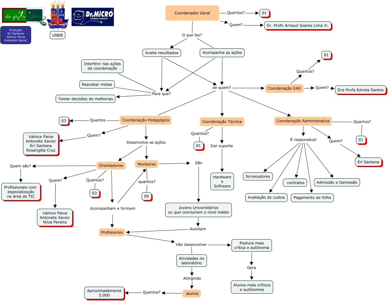 Este Mapa Conceitual tem informações relacionadas a: Profissionais_26_02_08, Coordenação Pedagógica Quem? Valnice Paiva Antonete Xavier Erí Santana Rosangêla Cruz, Coordenador Geral Quem? Dr. Profo Arnaud Soares Lima Jr., Orientadores Quem? Valnice Paiva Antonete Xavier Nilza Pereira, Avalia resulltados de quem? Coordenação EAD, Acompanha as ações Para que? Interferir nas ações da coordenação, Orientadores Acompanham e formam Professores, Coordenação Administrativa É responsável Avaliação de custos, Acompanha as ações de quem? Coordenação EAD, Coordenação Técnica Quantos? 01, Atividades no laboratório Atingindo alunos, Avalia resulltados Para que? Reavaliar metas, Orientadores Acompanham e formam Monitores, Avalia resulltados Para que? Interferir nas ações da coordenação, Coordenador Geral O que faz? Acompanha as ações, Coordenação Técnica Dar suporte Hardware e Software, Acompanha as ações de quem? Coordenação Técnica, Acompanha as ações Para que? Reavaliar metas, Coordenação Administrativa É responsável fornecedores, Coordenação Administrativa Quantos? 01, Coordenação Administrativa Quem? Erí Santana