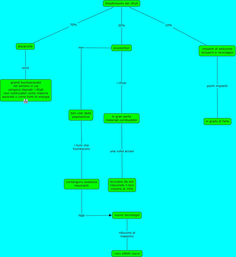 Questa Cmap, creata con IHMC CmapTools, contiene informazioni relative a: Smaltimento rifiuti, discariche sono grandi buchescavate nel terreno in cui vengono deposti i rifiuti non riutilizzabili come materie seconde o come fonti di energia, impianti di selezione recupero e reciclaggio pochi impianti in grado di farlo, Smaltimento dei rifiuti 10% impianti di selezione recupero e reciclaggio, contengono sostanze inquinanti oggi nuove tecnologie, inceneritori non ben visti dalla popolazione, in gran parte materiali combustibili una volta accesi bruciano da soli riducendo il loro volume al 10%, ben visti dalla popolazione i fumi che fuoriescono contengono sostanze inquinanti, nuove tecnologie riducono al massimo i loro effetti nocivi, Smaltimento dei rifiuti 70% discariche, inceneritori i rifiuti in gran parte materiali combustibili, Smaltimento dei rifiuti 20% inceneritori