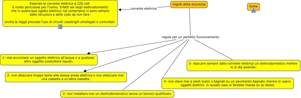 Questa Cmap, creata con IHMC CmapTools, contiene informazioni relative a: sicurezza, regole della sicurezza regole per un perfetto funzionamento 5- staccare sempre dalla corrente elettrica un elettrodomestico mentre lo si sta pulendo., regole della sicurezza corrente elettrica Essendo la corrente elettrica a 220 volt è molto pericolosa per l'uomo. Infatti sia negli elettrodomestici che in qualunque ogetto elettrico noi compriamo ci sono sempre delle istruzioni e delle cose da non fare: anche la legge prevede l'uso di circuiti casalinghi omologati e controllati., regole della sicurezza regole per un perfetto funzionamento 1- mai avvicinare un oggetto elettrico all'acqua o a qualsiasi altro oggetto conduttore liquido., regole della sicurezza regole per un perfetto funzionamento 3- non installare mai un elettrodomenstico senza un tecnico qualificato., regole della sicurezza regole per un perfetto funzionamento 2- non attaccare troppe spine alla stessa presa elettrica e non attaccare mai una ciabatta a un'altra ciabatta., regole della sicurezza regole per un perfetto funzionamento 4- non stare mai a piedi scalzi o bagnati su un pavimento bagnato mentre si usano oggetti elettrici: in questo caso si farebbe massa su se stessi.