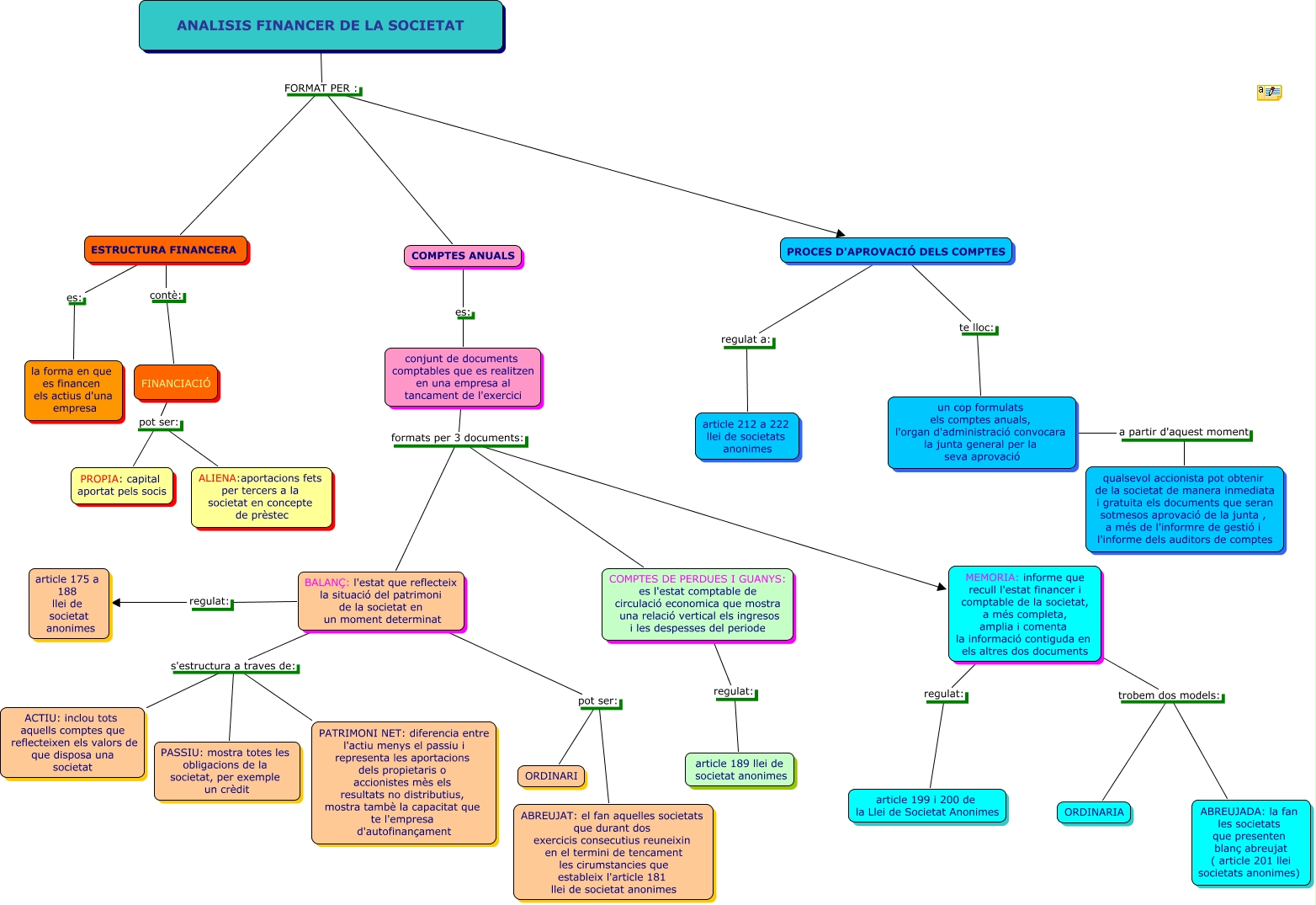 ESTRUCTURA FINANCERA ( CAS 4 ), ESTRUCTURA FINANCERA contè: FINANCIACIÓ, ANALISIS FINANCER DE LA SOCIETAT FORMAT PER : ESTRUCTURA FINANCERA, FINANCIACIÓ pot ser: ALIENA:aportacions fets per tercers a la societat en concepte de prèstec, BALANÇ: l'estat que reflecteix la situació del patrimoni de la societat en un moment determinat pot ser: ORDINARI, COMPTES ANUALS es: conjunt de documents comptables que es realitzen en una empresa al tancament de l'exercici, BALANÇ: l'estat que reflecteix la situació del patrimoni de la societat en un moment determinat s'estructura a traves de: ACTIU: inclou tots aquells comptes que reflecteixen els valors de que disposa una societat, ESTRUCTURA FINANCERA es: la forma en que es financen els actius d'una empresa, un cop formulats els comptes anuals, l'organ d'administració convocara la junta general per la seva aprovació a partir d'aquest moment qualsevol accionista pot obtenir de la societat de manera inmediata i gratuita els documents que seran sotmesos aprovació de la junta , a més de l'informre de gestió i l'informe dels auditors de comptes, BALANÇ: l'estat que reflecteix la situació del patrimoni de la societat en un moment determinat s'estructura a traves de: PATRIMONI NET: diferencia entre l'actiu menys el passiu i representa les aportacions dels propietaris o accionistes mès els resultats no distributius, mostra tambè la capacitat que te l'empresa d'autofinançament, MEMORIA: informe que recull l'estat financer i comptable de la societat, a més completa, amplia i comenta la informació contiguda en els altres dos documents trobem dos models: ORDINARIA