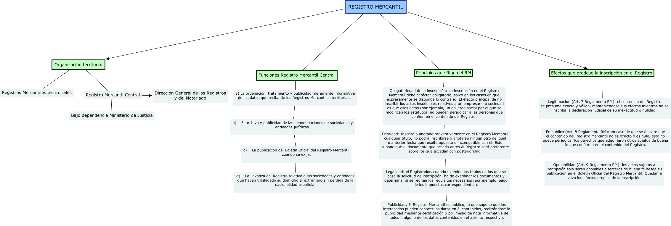 Este Cmap, tiene información relacionada con: Merca2 RM, Principios que Rigen el RM ???? Obligatoriedad de la inscripción: La inscripción en el Registro Mercantil tiene carácter obligatorio, salvo en los casos en que expresamente se disponga lo contrario. El efecto principal de no inscribir los actos inscribibles relativos a un empresario o sociedad es que esos actos (por ejemplo, un acuerdo social por el que se modifican los estatutos) no pueden perjudicar a las personas que confíen en el contenido del Registro., Organización territorial ???? Registros Mercantiles territoriales, c) La publicación del Boletín Oficial del Registro Mercantil cuando se exija. ???? d) La llevanza del Registro relativo a las sociedades y entidades que hayan trasladado su domicilio al extranjero sin pérdida de la nacionalidad española., b) El archivo y publicidad de las denominaciones de sociedades y entidades jurídicas. ???? c) La publicación del Boletín Oficial del Registro Mercantil cuando se exija., Fe pública (Art. 8 Reglamento RM): en caso de que se declare que el contenido del Registro Mercantil no es exacto o es nulo, esto no puede perjudicar los derechos que adquirieron otros sujetos de buena fe que confiaron en el contenido del Registro. ???? Oponibilidad (Art. 9 Reglamento RM): los actos sujetos a inscripción sólo serán oponibles a terceros de buena fe desde su publicación en el Boletín Oficial del Registro Mercantil. Quedan a salvo los efectos propios de la inscripción., Organización territorial ???? Registro Mercantil Central, Efectos que prodcue la inscripción en el Registro ???? Legitimación (Art. 7 Reglamento RM): el contenido del Registro se presume exacto y válido, manteniéndose sus efectos mientras no se inscriba la declaración judicial de su inexactitud o nulidad., REGISTRO MERCANTIL ???? Organización territorial, Funciones Registro Mercantil Central ???? a) La ordenación, tratamiento y publicidad meramente informativa de los datos que reciba de los Registros Mercantiles territoriales, REGISTRO MERCANTIL ???? Funciones Registro Mercantil Central, REGISTRO MERCANTIL ???? Principios que Rigen el RM, REGISTRO MERCANTIL ???? Efectos que prodcue la inscripción en el Registro, Legalidad: el Registrador, cuando examine los títulos en los que se basa la solicitud de inscripción, ha de examinar los documentos y determinar si se reúnen los requisitos necesarios (por ejemplo, pago de los impuestos correspondientes). ???? Publicidad: El Registro Mercantil es público, lo que supone que los interesados pueden conocer los datos en él contenidos, realizándose la publicidad mediante certificación o por medio de nota informativa de todos o alguno de los datos contenidos en el asiento respectivo., Registro Mercantil Central ???? Bajo dependencia Ministerio de Justicia, a) La ordenación, tratamiento y publicidad meramente informativa de los datos que reciba de los Registros Mercantiles territoriales ???? b) El archivo y publicidad de las denominaciones de sociedades y entidades jurídicas., Legitimación (Art. 7 Reglamento RM): el contenido del Registro se presume exacto y válido, manteniéndose sus efectos mientras no se inscriba la declaración judicial de su inexactitud o nulidad. ???? Fe pública (Art. 8 Reglamento RM): en caso de que se declare que el contenido del Registro Mercantil no es exacto o es nulo, esto no puede perjudicar los derechos que adquirieron otros sujetos de buena fe que confiaron en el contenido del Registro., Prioridad: Inscrito o anotado preventivamente en el Registro Mercantil cualquier título, no podrá inscribirse o anotarse ningún otro de igual o anterior fecha que resulte opuesto o incompatible con él. Esto supone que el documento que acceda antes al Registro será preferente sobre los que accedan con posterioridad. ???? Legalidad: el Registrador, cuando examine los títulos en los que se basa la solicitud de inscripción, ha de examinar los documentos y determinar si se reúnen los requisitos necesarios (por ejemplo, pago de los impuestos correspondientes)., Obligatoriedad de la inscripción: La inscripción en el Registro Mercantil tiene carácter obligatorio, salvo en los casos en que expresamente se disponga lo contrario. El efecto principal de no inscribir los actos inscribibles relativos a un empresario o sociedad es que esos actos (por ejemplo, un acuerdo social por el que se modifican los estatutos) no pueden perjudicar a las personas que confíen en el contenido del Registro. ???? Prioridad: Inscrito o anotado preventivamente en el Registro Mercantil cualquier título, no podrá inscribirse o anotarse ningún otro de igual o anterior fecha que resulte opuesto o incompatible con él. Esto supone que el documento que acceda antes al Registro será preferente sobre los que accedan con posterioridad., Registro Mercantil Central ???? Dirección General de los Registros y del Notariado
