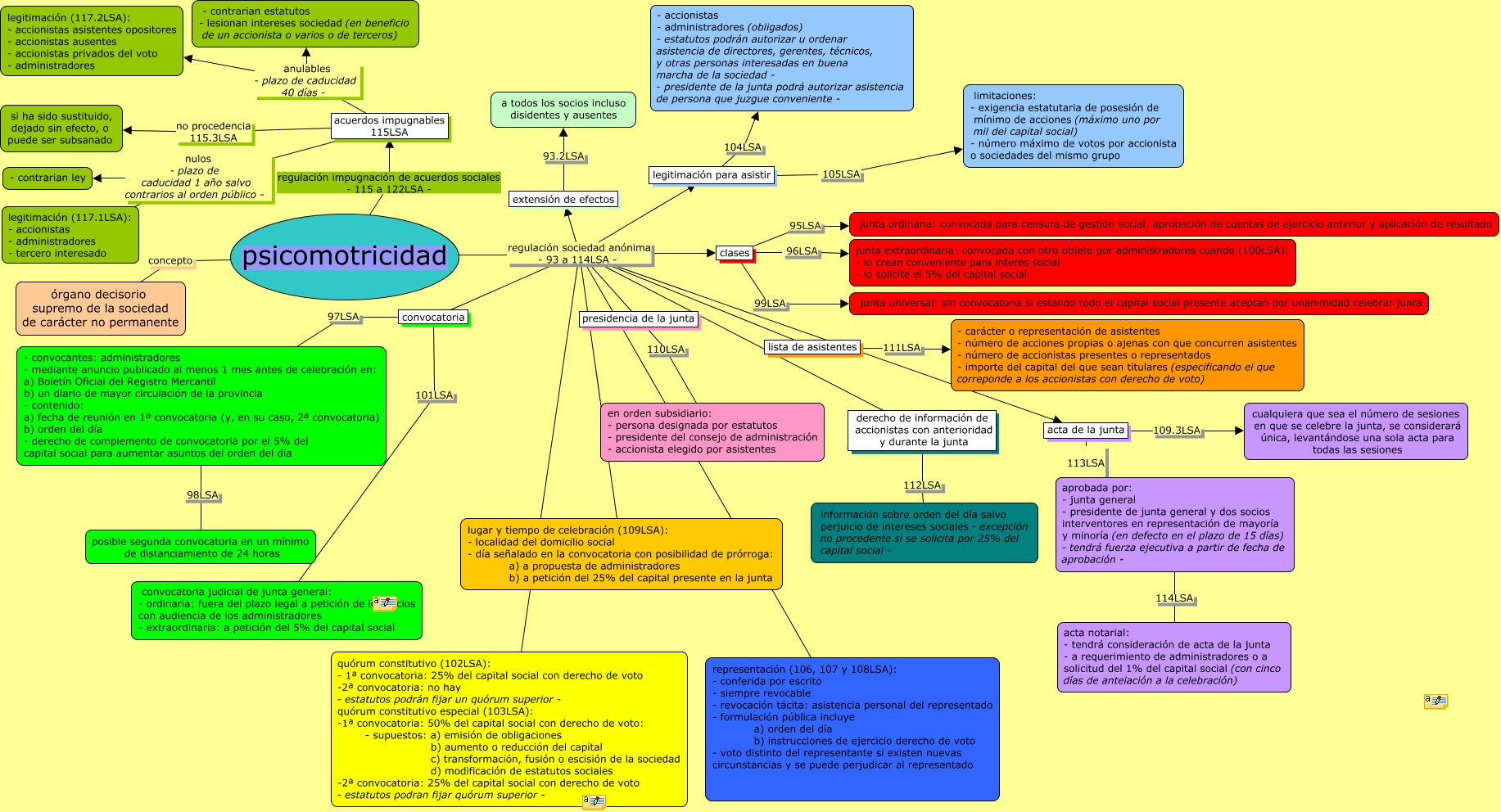 Este Cmap, tiene información relacionada con: MAPA 5.JUNTA GENERAL 2ª PARTE (SOCIEDAD ANÓNIMA), - convocantes: administradores - mediante anuncio publicado al menos 1 mes antes de celebración en: a) Boletín Oficial del Registro Mercantil b) un diario de mayor circulación de la provincia - contenido: a) fecha de reunión en 1ª convocatoria (y, en su caso, 2ª convocatoria) b) orden del día - derecho de complemento de convocatoria por el 5% del capital social para aumentar asuntos del orden del día 98LSA posible segunda convocatoria en un mínimo de distanciamiento de 24 horas, legitimación para asistir 104LSA - accionistas - administradores (obligados) - estatutos podrán autorizar u ordenar asistencia de directores, gerentes, técnicos, y otras personas interesadas en buena marcha de la sociedad - - presidente de la junta podrá autorizar asistencia de persona que juzgue conveniente -, psicomotricidad regulación sociedad anónima - 93 a 114LSA - representación (106, 107 y 108LSA): - conferida por escrito - siempre revocable - revocación tácita: asistencia personal del representado - formulación pública incluye a) orden del día b) instrucciones de ejercicio derecho de voto - voto distinto del representante si existen nuevas circunstancias y se puede perjudicar al representado, psicomotricidad concepto órgano decisorio supremo de la sociedad de carácter no permanente, psicomotricidad regulación sociedad anónima - 93 a 114LSA - lugar y tiempo de celebración (109LSA): - localidad del domicilio social - día señalado en la convocatoria con posibilidad de prórroga: a) a propuesta de administradores b) a petición del 25% del capital presente en la junta, derecho de información de accionistas con anterioridad y durante la junta 112LSA información sobre orden del día salvo perjuicio de intereses sociales - excepción no procedente si se solicita por 25% del capital social -, psicomotricidad regulación sociedad anónima - 93 a 114LSA - presidencia de la junta, psicomotricidad regulación sociedad anónima - 93 a 114LSA - extensión de efectos, acuerdos impugnables 115LSA anulables - plazo de caducidad 40 días - legitimación (117.2LSA): - accionistas asistentes opositores - accionistas ausentes - accionistas privados del voto - administradores, acta de la junta 113LSA aprobada por: - junta general - presidente de junta general y dos socios interventores en representación de mayoría y minoría (en defecto en el plazo de 15 días) - tendrá fuerza ejecutiva a partir de fecha de aprobación -, acuerdos impugnables 115LSA anulables - plazo de caducidad 40 días - - contrarian estatutos - lesionan intereses sociedad (en beneficio de un accionista o varios o de terceros), clases 99LSA junta universal: sin convocatoria si estando todo el capital social presente aceptan por unanimidad celebrar junta, convocatoria 97LSA - convocantes: administradores - mediante anuncio publicado al menos 1 mes antes de celebración en: a) Boletín Oficial del Registro Mercantil b) un diario de mayor circulación de la provincia - contenido: a) fecha de reunión en 1ª convocatoria (y, en su caso, 2ª convocatoria) b) orden del día - derecho de complemento de convocatoria por el 5% del capital social para aumentar asuntos del orden del día, aprobada por: - junta general - presidente de junta general y dos socios interventores en representación de mayoría y minoría (en defecto en el plazo de 15 días) - tendrá fuerza ejecutiva a partir de fecha de aprobación - 114LSA acta notarial: - tendrá consideración de acta de la junta - a requerimiento de administradores o a solicitud del 1% del capital social (con cinco días de antelación a la celebración), acta de la junta 109.3LSA cualquiera que sea el número de sesiones en que se celebre la junta, se considerará única, levantándose una sola acta para todas las sesiones, psicomotricidad regulación sociedad anónima - 93 a 114LSA - quórum constitutivo (102LSA): - 1ª convocatoria: 25% del capital social con derecho de voto -2ª convocatoria: no hay - estatutos podrán fijar un quórum superior - quórum constitutivo especial (103LSA): -1ª convocatoria: 50% del capital social con derecho de voto: - supuestos: a) emisión de obligaciones b) aumento o reducción del capital c) transformación, fusión o escisión de la sociedad d) modificación de estatutos sociales -2ª convocatoria: 25% del capital social con derecho de voto - estatutos podran fijar quórum superior -, convocatoria 101LSA convocatoria judicial de junta general: - ordinaria: fuera del plazo legal a petición de los socios con audiencia de los administradores - extraordinaria: a petición del 5% del capital social, psicomotricidad regulación sociedad anónima - 93 a 114LSA - acta de la junta, lista de asistentes 111LSA - carácter o representación de asistentes - número de acciones propias o ajenas con que concurren asistentes - número de accionistas presentes o representados - importe del capital del que sean titulares (especificando el que correponde a los accionistas con derecho de voto), psicomotricidad regulación sociedad anónima - 93 a 114LSA - convocatoria