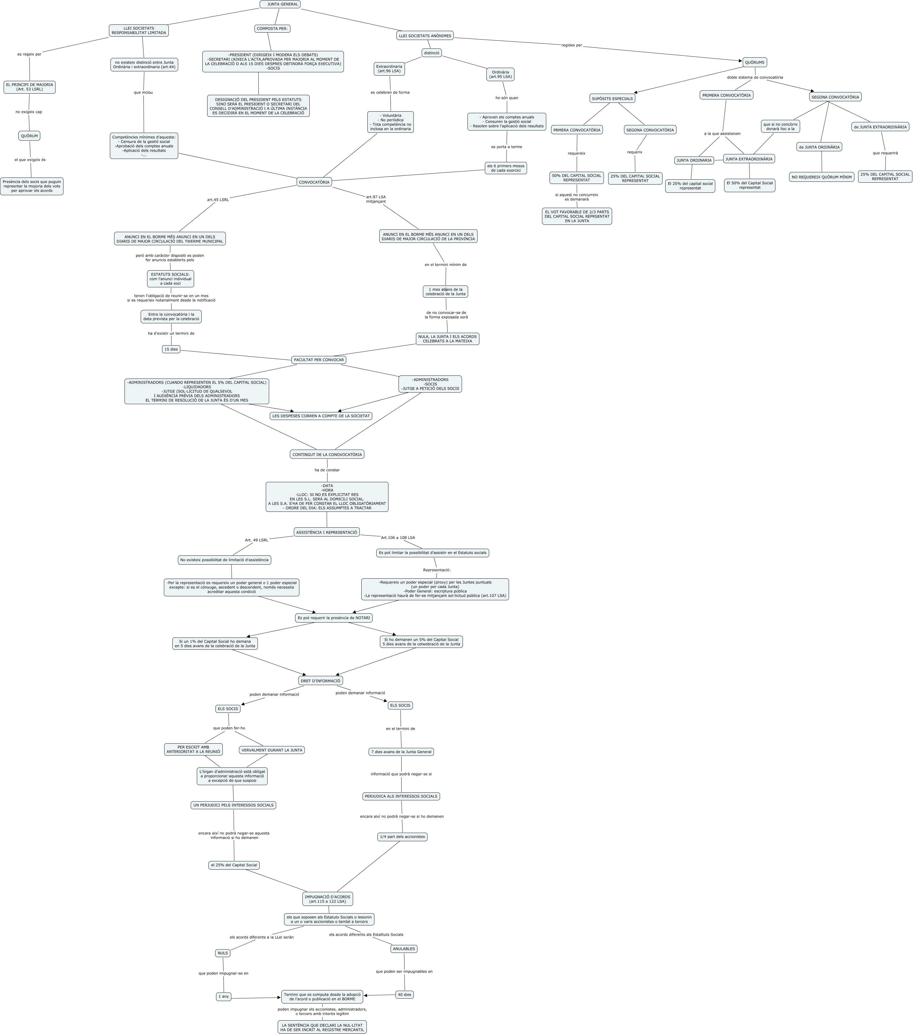 Este mapa conceptual tiene información relacionada a: Cmap 5 Junta General, -PRESIDENT (DIRIGEIX I MODERA ELS DEBATS) -SECRETARI (AIXECA L'ACTA,APROVADA PER MAJORIA AL MOMENT DE LA CELEBRACIÓ O ALS 15 DIES DESPRES OBTINDRÀ FORÇA EXECUTIVA) -SOCIS ???? DESIGNACIÓ DEL PRESIDENT PELS ESTATUTS SINO SERÀ EL PRESIDENT O SECRETARI DEL CONSELL D'ADMINISTRACIÓ I A ÚLTIMA INSTÀNCIA ES DECIDIRÀ EN EL MOMENT DE LA CELEBRACIÓ, de JUNTA ORDINÀRIA ???? NO REQUEREIX QUÒRUM MÍNIM, 40 dies ???? Termini que es computa desde la adopció de l'acord o publicació en el BORME, Es pot requerir la presència de NOTARI ???? Si un 1% del Capital Social ho demana en 5 dies avans de la celebració de la Junta, no existeix distinció entre Junta Ordinària i extraordinaria (art.44) que inclou Competències mínimes d'aquesta: - Censura de la gestió social -Aprobació dels comptes anuals -Aplicació dels resultats -..., -Per la representació es requereix un poder general o 1 poder especial excepte: si es el cónyuge, ascedent o descendent, només necessita acreditar aquesta condició ???? Es pot requerir la presència de NOTARI, CONTINGUT DE LA CONOVOCATÒRIA ha de constar -DATA -HORA -LLOC: SI NO ES EXPLICITAT RES EN LES S.L. SERÀ AL DOMICILI SOCIAL. A LES S.A. S'HA DE FER CONSTAR EL LLOC OBLIGATÒRIAMENT - ORDRE DEL DIA: ELS ASSUMPTES A TRACTAR, Termini que es computa desde la adopció de l'acord o publicació en el BORME poden impugnar els accionistes, administradors, o tercers amb interès legítim LA SENTÈNCIA QUE DECLARI LA NUL·LITAT HA DE SER INCRIT AL REGISTRE MERCANTIL, -ADMINISTRADORS -SOCIS -JUTGE A PETICIÓ DELS SOCIS ???? CONTINGUT DE LA CONOVOCATÒRIA, LLEI SOCIETATS RESPONSABILITAT LIMITADA ???? no existeix distinció entre Junta Ordinària i extraordinaria (art.44), Es pot requerir la presència de NOTARI ???? Si ho demanen un 5% del Capital Social 5 dies avans de la celwebració de la Junta, el 25% del Capital Social ???? IMPUGNACIÓ D'ACORDS (art.115 a 122 LSA), ANUNCI EN EL BORME MÉS ANUNCI EN UN DELS DIARIS DE MAJOR CIRCULACIÓ DEL TWERME MUNICIPAL però amb caràcter dispositi es poden fer anuncis establerts pels ESTATUTS SOCIALS: com l'anunci individual a cada soci, Si ho demanen un 5% del Capital Social 5 dies avans de la celwebració de la Junta ???? DRET D'INFORMACIÓ, PERJUDICA ALS INTERESSOS SOCIALS encara així no podrà negar-se si ho demanen 1/4 part dels accionistes, JUNTA ORDINARIA ???? JUNTA EXTRAORDINÀRIA, distinció ???? Extraordinaria (art.96 LSA), DRET D'INFORMACIÓ poden demanar informació ELS SOCIS, que si no concòrre donarà lloc a la ???? JUNTA EXTRAORDINÀRIA, -ADMINISTRADORS -SOCIS -JUTGE A PETICIÓ DELS SOCIS ???? LES DESPESES CORREN A COMPTE DE LA SOCIETAT