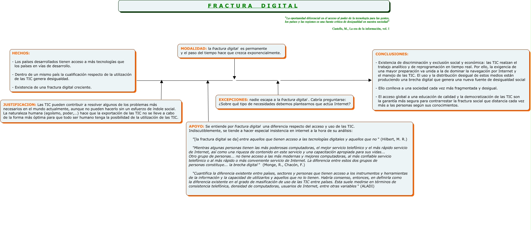 Este Cmap, tiene información relacionada con: Hilo Fractura Digital_TELLO VALENZUELA_DAVID, HECHOS: - Los países desarrollados tienen acceso a más tecnologías que los países en vías de desarrollo. - Dentro de un mismo país la cualificación respecto de la utilización de las TIC genera desigualdad. - Existencia de una fractura digital creciente. CONCLUSIONES: - Existencia de discriminación y exclusión social y económica: las TIC realzan el trabajo analítico y de reprogramación en tiempo real. Por ello, la exigencia de una mayor preparación va unida a la de dominar la navegación por Internet y el manejo de las TIC. El uso y la distribución desigual de estos medios están produciendo una brecha digital que genera una nueva fuente de desigualdad social - Ello conlleva a una sociedad cada vez más fragmentada y desigual. - El acceso global a una educación de calidad y la democratización de las TIC son la garantía más segura para contrarrestar la fractura social que distancia cada vez más a las personas según sus conocimientos., EXCEPCIONES: nadie escapa a la fractura digital. Cabría preguntarse: ¿Sobre qué tipo de necesidades debemos plantearnos que actúa Internet? ????, JUSTIFICACION: Las TIC pueden contribuir a resolver algunos de los problemas más necesarios en el mundo actualmente, aunque no pueden hacerlo sin un esfuerzo de índole social. La naturaleza humana (egoísmo, poder,…) hace que la exportación de las TIC no se lleve a cabo de la forma más óptima para que todo ser humano tenga la posibilidad de la utilización de las TIC. ????, MODALIDAD: la fractura digital es permanente y el paso del tiempo hace que crezca exponencialmente. ????, APOYO: Se entiende por fractura digital una diferencia respecto del acceso y uso de las TIC. Indiscutiblemente, se tiende a hacer especial insistencia en internet a la hora de su análisis: ”[la fractura digital se da] entre aquellos que tienen acceso a las tecnologías digitales y aquellos que no" (Hilbert, M. R.) "Mientras algunas personas tienen las más poderosas computadoras, el mejor servicio telefónico y el más rápido servicio de Internet, así como una riqueza de contenido en este servicio y una capacitación apropiada para sus vidas... Otro grupo de personas... no tiene acceso a las más modernas y mejores computadoras, al más confiable servicio telefónico o al más rápido o más conveniente servicio de Internet. La diferencia entre estos dos grupos de personas constituye... la brecha digital" (Monge, R., Chacón, F.) "Cuantifica la diferencia existente entre países, sectores y personas que tienen acceso a los instrumentos y herramientas de la información y la capacidad de utilizarlos y aquellos que no lo tienen. Habría consenso, entonces, en definirla como la diferencia existente en el grado de masificación de uso de las TIC entre países. Esta suele medirse en términos de consistencia telefónica, densidad de computadoras, usuarios de Internet, entre otras variables" (ALADI) ????