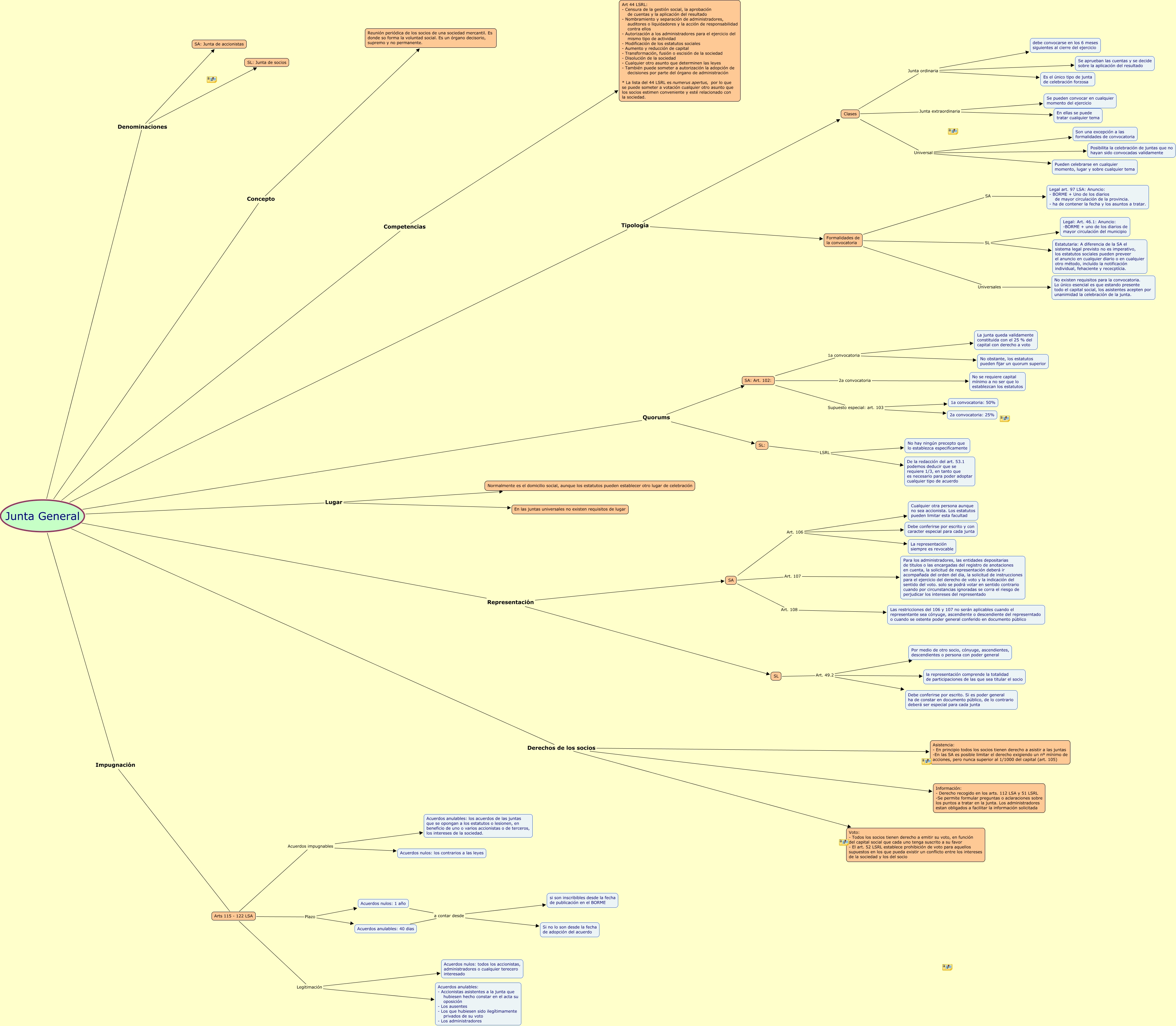 Este mapa conceptual tiene información relacionada a: Junta General, Junta General Lugar En las juntas universales no existen requisitos de lugar, SA Art. 108 Las restricciones del 106 y 107 no serán aplicables cuando el representante sea cónyuge, ascendiente o descendiente del represerntado o cuando se ostente poder general conferido en documento público, Arts 115 - 122 LSA Legitimación Acuerdos anulables: - Accionistas asistentes a la junta que hubiesen hecho constar en el acta su oposición - Los ausentes - Los que hubiesen sido ilegítimamente privados de su voto - Los administradores, SL: LSRL No hay ningún precepto que lo establezca especificamente, Arts 115 - 122 LSA Legitimación Acuerdos nulos: todos los accionistas, administradores o cualquier terecero interesado, Junta General Concepto Reunión periódica de los socios de una sociedad mercantil. Es donde so forma la voluntad social. Es un órgano decisorio, supremo y no permanente., Junta General Denominaciones SA: Junta de accionistas, Junta General Tipología Formalidades de la convocatoria, Arts 115 - 122 LSA Plazo Acuerdos anulables: 40 dias, SA Art. 106 Cualquier otra persona aunque no sea accionista. Los estatutos pueden limitar esta facultad