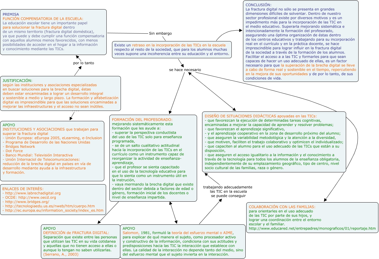 Este Cmap, tiene información relacionada con: Hilo fractura digital_Municio_Zúñiga_Ana, JUSTIFICACIÓN: según las instituciones y asociaciones especializadas en buscar soluciones para la brecha digital, éstas deben estar encaminadas a lograr un desarrollo integral y sostenible a medio y largo plazo. La formación y alfabetización digital es imprescindible para que las soluciones encaminadas a mejorar las infraestructuras y el acceso no sean inútiles. por lo tanto PREMISA FUNCIÓN COMPENSATORIA DE LA ESCUELA: La educación escolar tiene un importante papel para solucionar la fractura digital dentro de un mismo territorio (fractura digital doméstica), ya que puede y debe cumplir una función compensatoria con aquellos alumnos menos favorecidos, con menos posibilidades de acceder en el hogar a la información y conocimiento mediante las TICs., Existe un retraso en la incorporación de las TICs en la escuela respecto al resto de la sociedad, que para los alumnos muchas veces supone una incoherencia entre su educación y el entorno. se hace necesario COLABORACIÓN CON LAS FAMILIAS: para orientarles en el uso adecuado de las TIC por parte de sus hijos, y lograr una coordinación entre el entorno escolar y el familiar. http://www.educared.net/entrepadres/monograficos/01/reportaje.htm, Existe un retraso en la incorporación de las TICs en la escuela respecto al resto de la sociedad, que para los alumnos muchas veces supone una incoherencia entre su educación y el entorno. se hace necesario DISEÑO DE SITUACIONES DIDÁCTICAS apoyadas en las TICs: - que favorezcan la ejecución de determinadas tareas cognitivas, encaminadas a mejorar la capacidad de aprender y resolver problemas; - que favorezcan el aprendizaje significativo, - y el aprendizaje cooperativo en la zona de desarrollo próximo del alumno; - que aseguren la variabilidad metodológica y la atención a la diversidad, - que motiven, faciliten el trabajo colaborativo y optimicen el individualizado; - que capaciten al alumno para el uso adecuado de las TICs que están a su disposición, - que aseguren el acceso igualitario a la información y el conocimiento a través de la tecnología para todos los alumnos de la enseñanza obligatoria, independientemente de su emplazamiento geográfico, tipo de centro, nivel socio cultural de las familias, raza o género., PREMISA FUNCIÓN COMPENSATORIA DE LA ESCUELA: La educación escolar tiene un importante papel para solucionar la fractura digital dentro de un mismo territorio (fractura digital doméstica), ya que puede y debe cumplir una función compensatoria con aquellos alumnos menos favorecidos, con menos posibilidades de acceder en el hogar a la información y conocimiento mediante las TICs. Sin embargo Existe un retraso en la incorporación de las TICs en la escuela respecto al resto de la sociedad, que para los alumnos muchas veces supone una incoherencia entre su educación y el entorno., FORMACIÓN DEL PROFESORADO: mejorando sistemáticamente esta formación que les ayude a: - superar la perspectiva conductista del uso de las TIC solo para enseñanza programada, - se de un salto cualitativo actitudinal hacia la incorporación de las TICs en el currículo como un instrumento capaz de reorganizar la actividad de enseñanza- aprendizaje, - que el profesor se sienta capacitado en el uso de la tecnología educativa para que lo sienta como un instrumento útil en la instrución, - vaya mermando la brecha digital que existe dentro del sector debida a factores de edad o género, formación inicial de los docentes o nivel de enseñanza impartida. ???? APOYO DEFINICIÓN de FRACTURA DIGITAL: Separación que existe entre las personas que utilizan las TIC en su vida cotidanea y aquellas que no tienen acceso a ellas o aunque lo tengan no saben utilizarlas. (Serrano, A., 2003), APOYO Salomon, 1981, formuló la teoría del esfuerzo mental o AIME, para explicar de qué manera el sujeto, como procesador activo y constructivo de la información, condiciona con sus actitudes y predisposiciones hacia las TIC la interacción que establece con ellas. La calidad de la interacción no depende tanto del medio, sino del esfuerzo mental que el sujeto invierta en la interacción. trabajando adecuadamente las TIC en la escuela se puede conseguir DISEÑO DE SITUACIONES DIDÁCTICAS apoyadas en las TICs: - que favorezcan la ejecución de determinadas tareas cognitivas, encaminadas a mejorar la capacidad de aprender y resolver problemas; - que favorezcan el aprendizaje significativo, - y el aprendizaje cooperativo en la zona de desarrollo próximo del alumno; - que aseguren la variabilidad metodológica y la atención a la diversidad, - que motiven, faciliten el trabajo colaborativo y optimicen el individualizado; - que capaciten al alumno para el uso adecuado de las TICs que están a su disposición, - que aseguren el acceso igualitario a la información y el conocimiento a través de la tecnología para todos los alumnos de la enseñanza obligatoria, independientemente de su emplazamiento geográfico, tipo de centro, nivel socio cultural de las familias, raza o género., Existe un retraso en la incorporación de las TICs en la escuela respecto al resto de la sociedad, que para los alumnos muchas veces supone una incoherencia entre su educación y el entorno. ???? CONCLUSIÓN: La fractura digital no sólo se presenta en grandes dimensiones difíciles de solventar. Dentro de nuestro sector profesional existe por diversos motivos y es un impedimento más para la incorporación de las TIC en el medio educativo. Superarla mejorando sistemática e intencionadamente la formación del profesorado, asegurando una óptima organización de éstas dentro de los centros educativos y trabajando para su incorporación real en el currículo y en la práctica docente, se hace imprescindible para lograr influir en la fractura digital de la sociedad a través de la formación de los alumnos. Facilitar el acceso a a las TIC y formarle