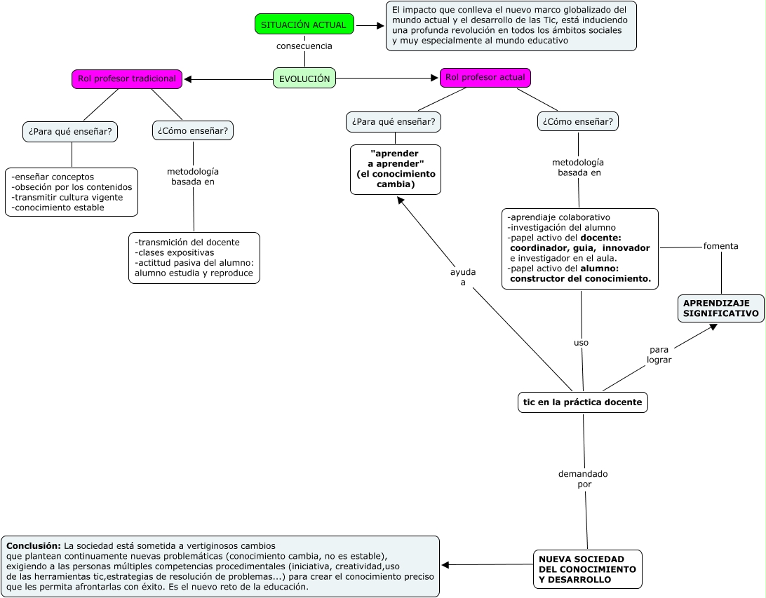 Este Cmap, tiene información relacionada con: Hilo Rol del profesor-Mora Hernández_Carmen, ¿Cómo enseñar? metodología basada en -transmición del docente -clases expositivas -actittud pasiva del alumno: alumno estudia y reproduce, Rol profesor tradicional ???? ¿Cómo enseñar?, -aprendiaje colaborativo -investigación del alumno -papel activo del docente: coordinador, guia, innovador e investigador en el aula. -papel activo del alumno: constructor del conocimiento. uso tic en la práctica docente, ¿Para qué enseñar? ???? "aprender a aprender" (el conocimiento cambia), ¿Para qué enseñar? ???? -enseñar conceptos -obseción por los contenidos -transmitir cultura vigente -conocimiento estable, ¿Cómo enseñar? metodología basada en -aprendiaje colaborativo -investigación del alumno -papel activo del docente: coordinador, guia, innovador e investigador en el aula. -papel activo del alumno: constructor del conocimiento., Rol profesor tradicional ???? ¿Para qué enseñar?, EVOLUCIÓN ???? Rol profesor tradicional, tic en la práctica docente para lograr APRENDIZAJE SIGNIFICATIVO, tic en la práctica docente demandado por NUEVA SOCIEDAD DEL CONOCIMIENTO Y DESARROLLO, Rol profesor actual ???? ¿Para qué enseñar?, Rol profesor actual ???? ¿Cómo enseñar?, SITUACIÓN ACTUAL consecuencia EVOLUCIÓN, -aprendiaje colaborativo -investigación del alumno -papel activo del docente: coordinador, guia, innovador e investigador en el aula. -papel activo del alumno: constructor del conocimiento. fomenta APRENDIZAJE SIGNIFICATIVO, EVOLUCIÓN ???? Rol profesor actual, NUEVA SOCIEDAD DEL CONOCIMIENTO Y DESARROLLO ???? Conclusión: La sociedad está sometida a vertiginosos cambios que plantean continuamente nuevas problemáticas (conocimiento cambia, no es estable), exigiendo a las personas múltiples competencias procedimentales (iniciativa, creatividad,uso de las herramientas tic,estrategias de resolución de problemas...) para crear el conocimiento preciso que les permita afrontarlas con éxito. Es el nuevo reto de la educación., SITUACIÓN ACTUAL ???? El impacto que conlleva el nuevo marco globalizado del mundo actual y el desarrollo de las Tic, está induciendo una profunda revolución en todos los ámbitos sociales y muy especialmente al mundo educativo, tic en la práctica docente ayuda a "aprender a aprender" (el conocimiento cambia)