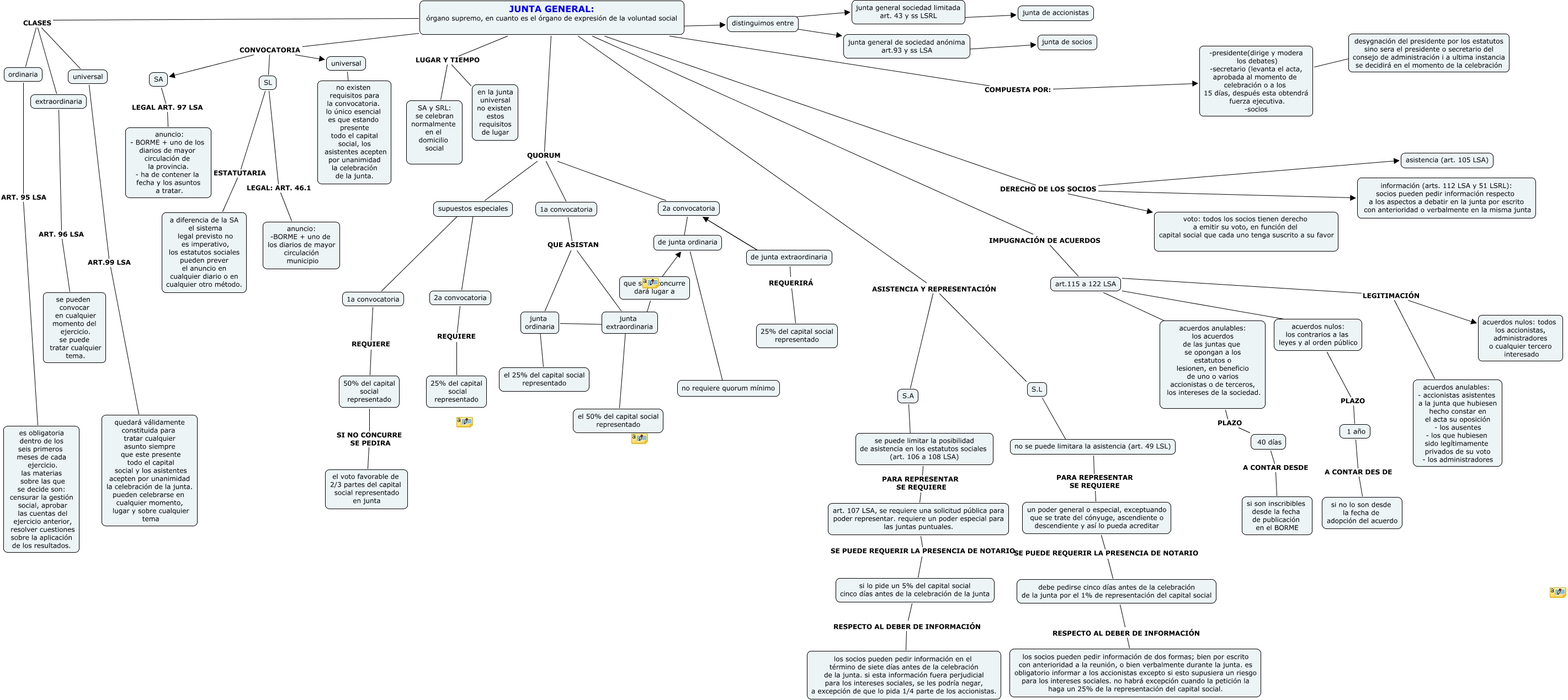 Este mapa conceptual tiene información relacionada a: CMap 5, ordinaria ART. 95 LSA es obligatoria dentro de los seis primeros meses de cada ejercicio. las materias sobre las que se decide son: censurar la gestión social, aprobar las cuentas del ejercicio anterior, resolver cuestiones sobre la aplicación de los resultados., distinguimos entre junta general sociedad limitada art. 43 y ss LSRL, JUNTA GENERAL: órgano supremo, en cuanto es el órgano de expresión de la voluntad social LUGAR Y TIEMPO SA y SRL: se celebran normalmente en el domicilio social, JUNTA GENERAL: órgano supremo, en cuanto es el órgano de expresión de la voluntad social DERECHO DE LOS SOCIOS voto: todos los socios tienen derecho a emitir su voto, en función del capital social que cada uno tenga suscrito a su favor, distinguimos entre junta general de sociedad anónima art.93 y ss LSA, 1 año A CONTAR DES DE si no lo son desde la fecha de adopción del acuerdo, JUNTA GENERAL: órgano supremo, en cuanto es el órgano de expresión de la voluntad social ASISTENCIA Y REPRESENTACIÓN S.A, JUNTA GENERAL: órgano supremo, en cuanto es el órgano de expresión de la voluntad social LUGAR Y TIEMPO en la junta universal no existen estos requisitos de lugar, 1a convocatoria QUE ASISTAN junta extraordinaria, 50% del capital social representado SI NO CONCURRE SE PEDIRA el voto favorable de 2/3 partes del capital social representado en junta