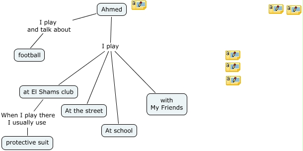 This Concept Map, created with IHMC CmapTools, has information related to: Football_by_Ahmed, Ahmed I play At school, at El Shams club When I play there I usually use protective suit, Ahmed I play At the street, Ahmed I play at El Shams club, Ahmed I play and talk about football, Ahmed I play with My Friends