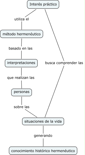 Este mapa conceptual tiene información relacionada a: Interes_Practico, personas sobre las situaciones de la vida, método hermenéutico basado en las interpretaciones, Interés práctico utiliza el método hermenéutico, situaciones de la vida generando conocimiento histórico hermenéutico, Interés práctico busca comprender las situaciones de la vida, interpretaciones que realizan las personas